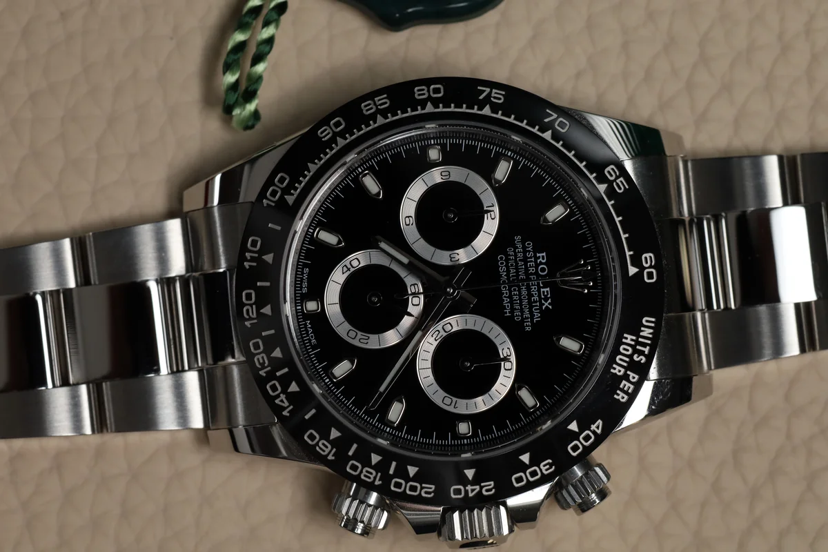 Introduced at BaselWorld 2016, the Rolex Daytona 116500ln-0001 features a stainless steel case and a black ceramic bezel. Reference 116500ln-0002 is similar though fitted with a black dial. This Oyster Perpetual Cosmograph Daytona in Oystersteel with a black dial and an Oyster bracelet, features a black Cerachrom bezel with tachymetric scale.