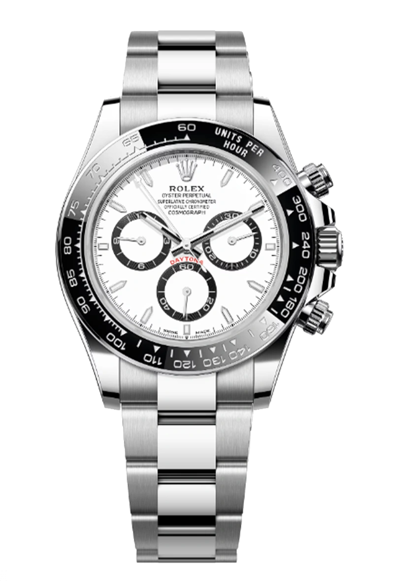 The Rolex Cosmograph Daytona 126500LN-0001 also nicknamed the Panda Daytona was introduced in 2023. This Daytona has a stainless steel case crowned by a black Cerachrom bezel with engraved tachymeter scale. This watch is powered by the updated caliber 4131. This Daytona is fitted with an Oyster bracelet.