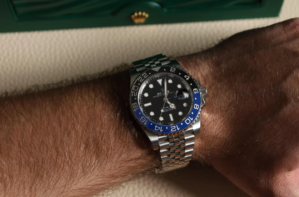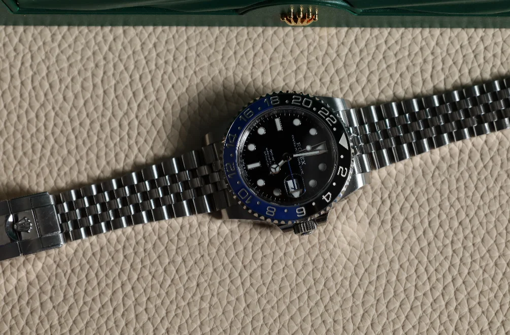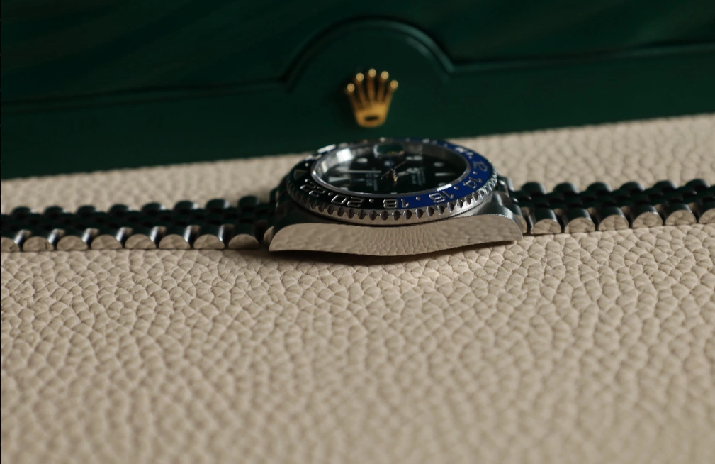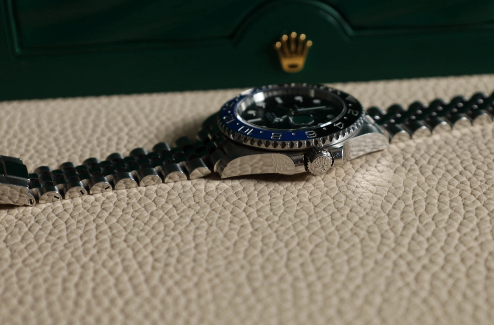 The Rolex GMT-Master 126710 was introduced at BaselWorld 2018 as the 'Pepsi', while the version shown here was added to the collection in 2019. Reference 126710blnr-0002 features the 'Batman' bezel in black and blue. It is fitted with a Jubilee-type bracelet.