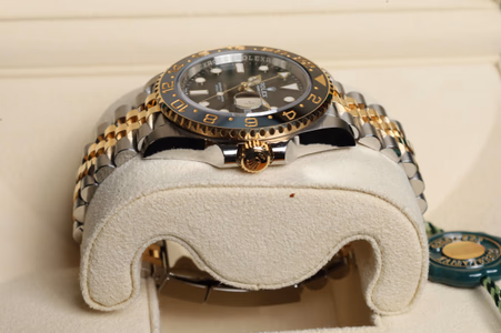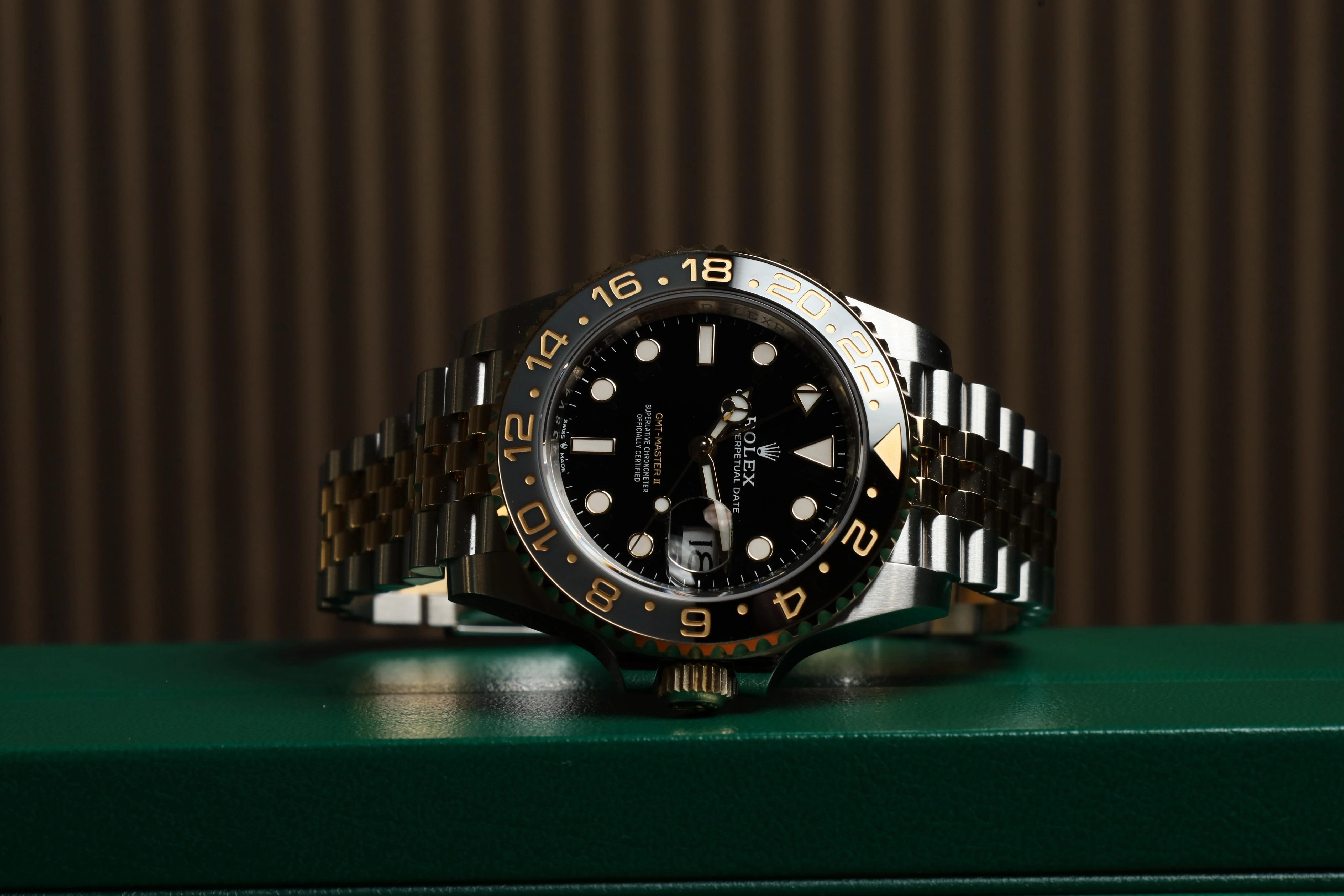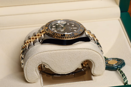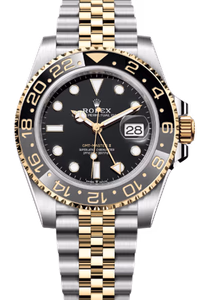 The Rolex GMT-Master II 126713GRNR-0001 of 2023 has case and bracelet done in a combination of stainless steel and yellow gold. The ceramic bezel insert is executed in grey and black ceramic. This model features a black dial and a two-colour Cerachrom bezel insert in grey and black ceramic. In addition to conventional hour, minute and seconds hands, the GMT-Master II features an arrow-tipped hand, which circles the dial once every 24 hours, as well as a bidirectional rotatable 24-hour graduated bezel.