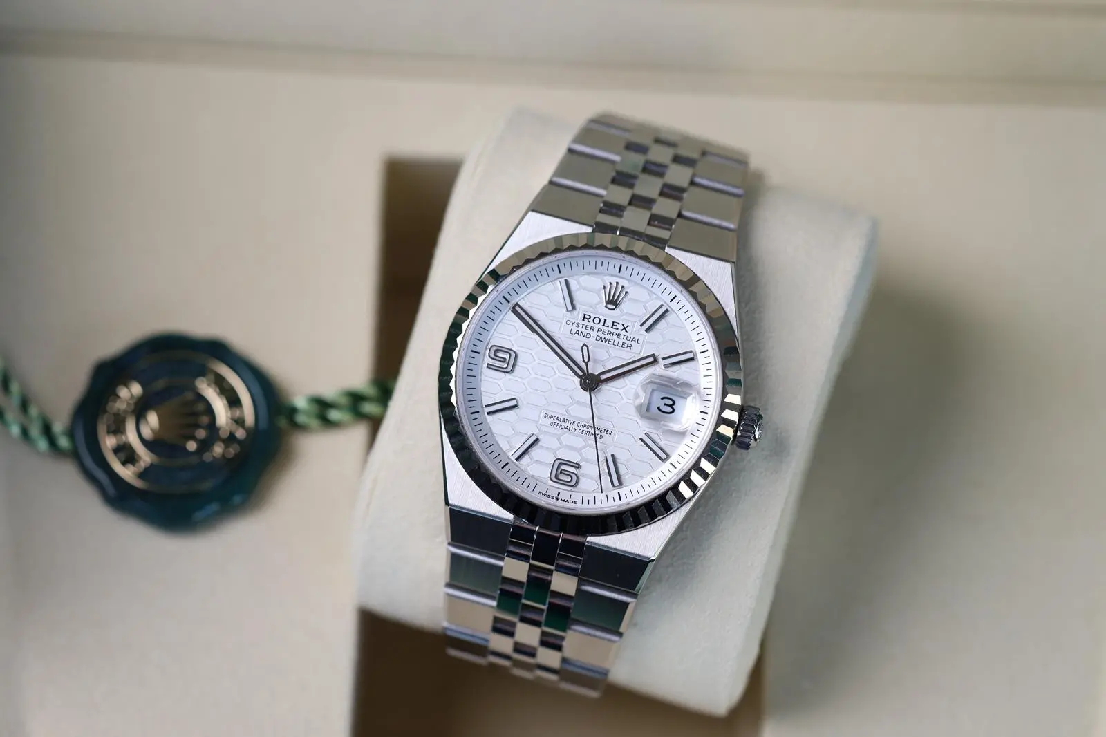 The Rolex Land-Dweller 36 127234-0001 debuted in 2025. This watch has a stainless steel case with a fluted white gold bezel, and an integrated 'Flat Jubilee' bracelet. The Land-Dweller 36 has an intense white, honeycomb-motif dial and Flat Jubilee bracelet.