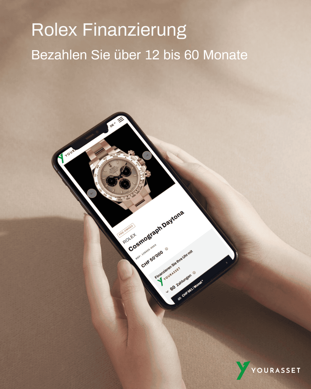 Bezahlen Sie Ihre nächste Rolex in 12 bis 60 Monaten bis zu einem Kaufpreis von CHF 250'000. Die monatlichen Zahlungen können Sie mit Ihrem regelmässigen Einkommen tätigen. Gleichzeitig schützen Sie sich vor (Retail) Preisinflation, da Sie den Kaufpreis heute fixieren. Luxusbrands erhöhten in der Vergangenheit die Retailpreise der Uhren meist ein oder zweimal im Jahr. Besonders Modelle in Gold wurden zuletzt aufgrund des steigenden Goldpreises teils deutlich teurer.