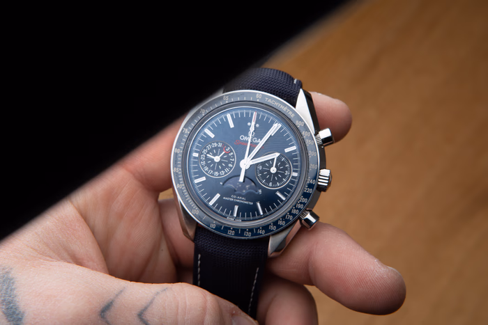 Introduced in anticipation of BaselWorld 2016, the Speedmaster Moonphase Chronograph Master Chronometer is a new model in the Speedmaster family, fitted with a new, in-house, METAS-certified chronograph movement with moonphase complication and date based on caliber 9300. The Speedmaster Moonphase Chronograph Master Chronometer has a stainless steel case of 44.25mm, with a ceramic tachymeter ring and 'box' shaped sapphire crystal. The moonphase disc is done in metalized mineral crystal, allowing Omega to print it with great detail - the moon is said to even show an astronaut's footprint.