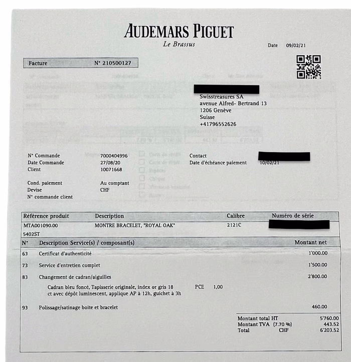 Certificate of authenticity and Audemars Piguet service invoice