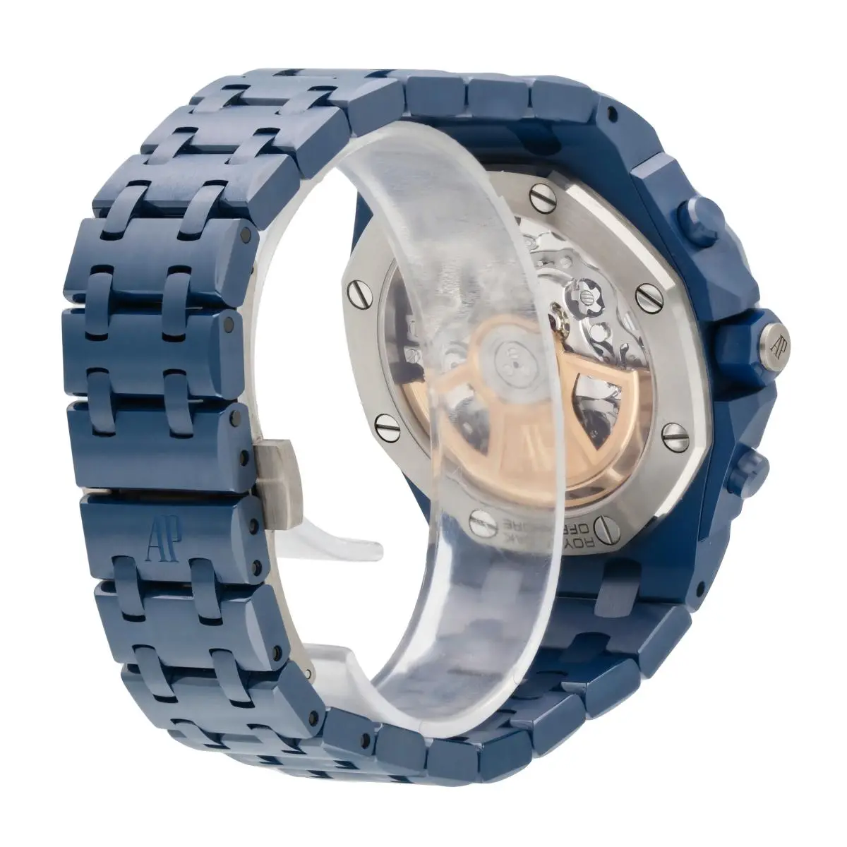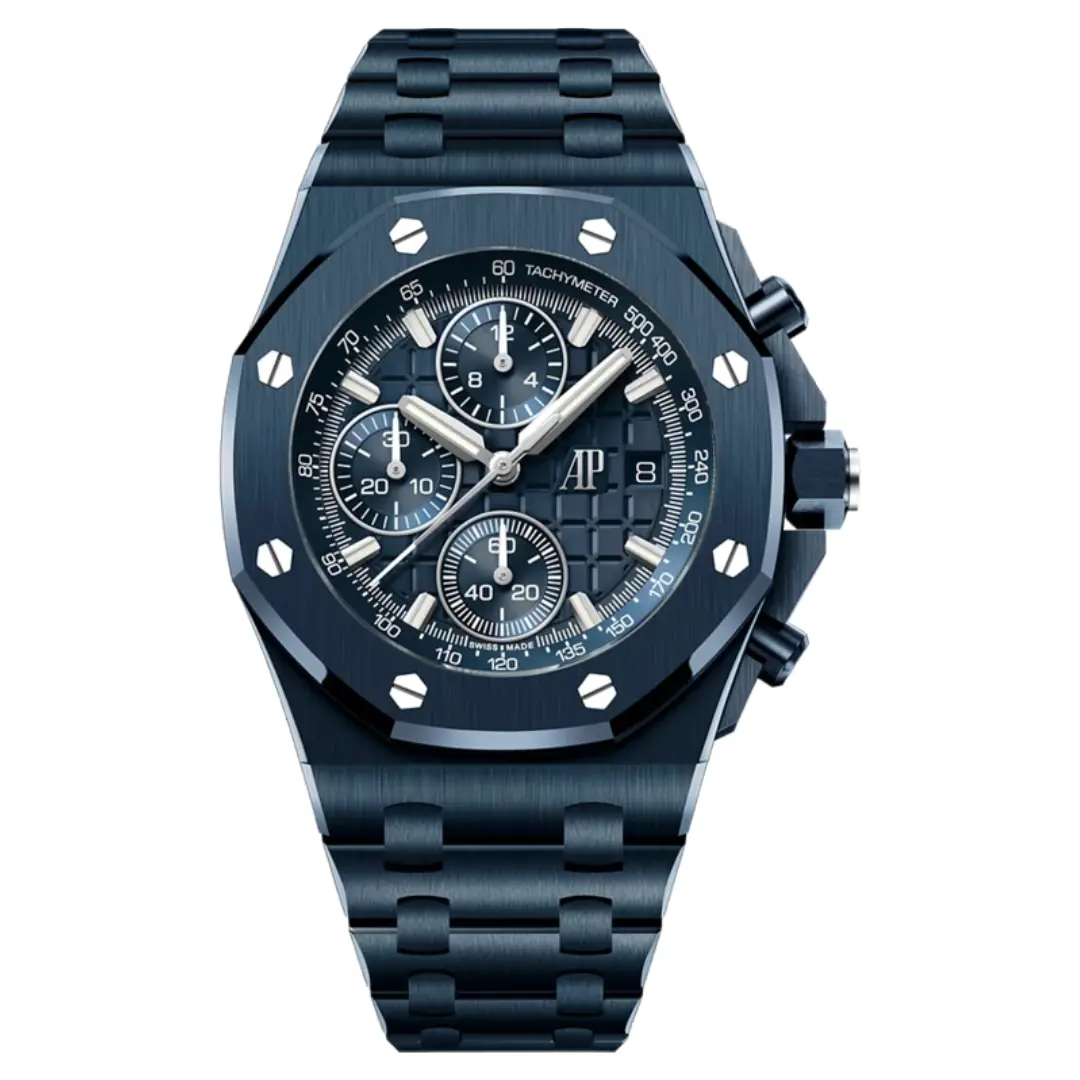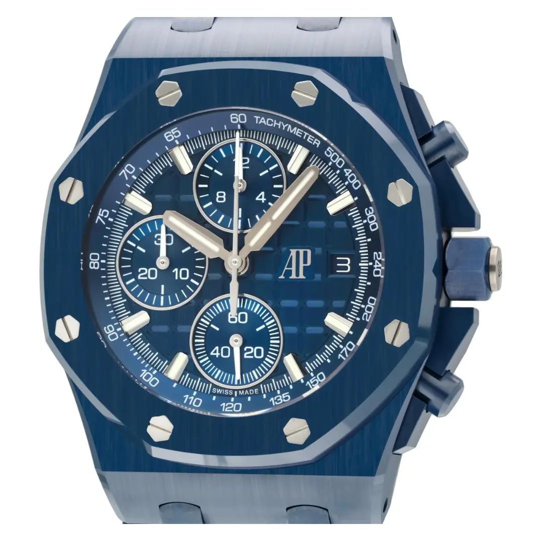 Audemars Piguet Royal Oak Offshore Ref. 26238CD.OO.1300CD.01 was introduced in 2025. This watch has a 'Blue Nuit, Nuage 50' ceramic case of 42.00mm, which is paired with a matching bracelet. Inside tick a caliber AP 4404, a self-winding movement with flyback chronograph and date, which can be admired through the see-through (titanium) back. The dial is Blue.