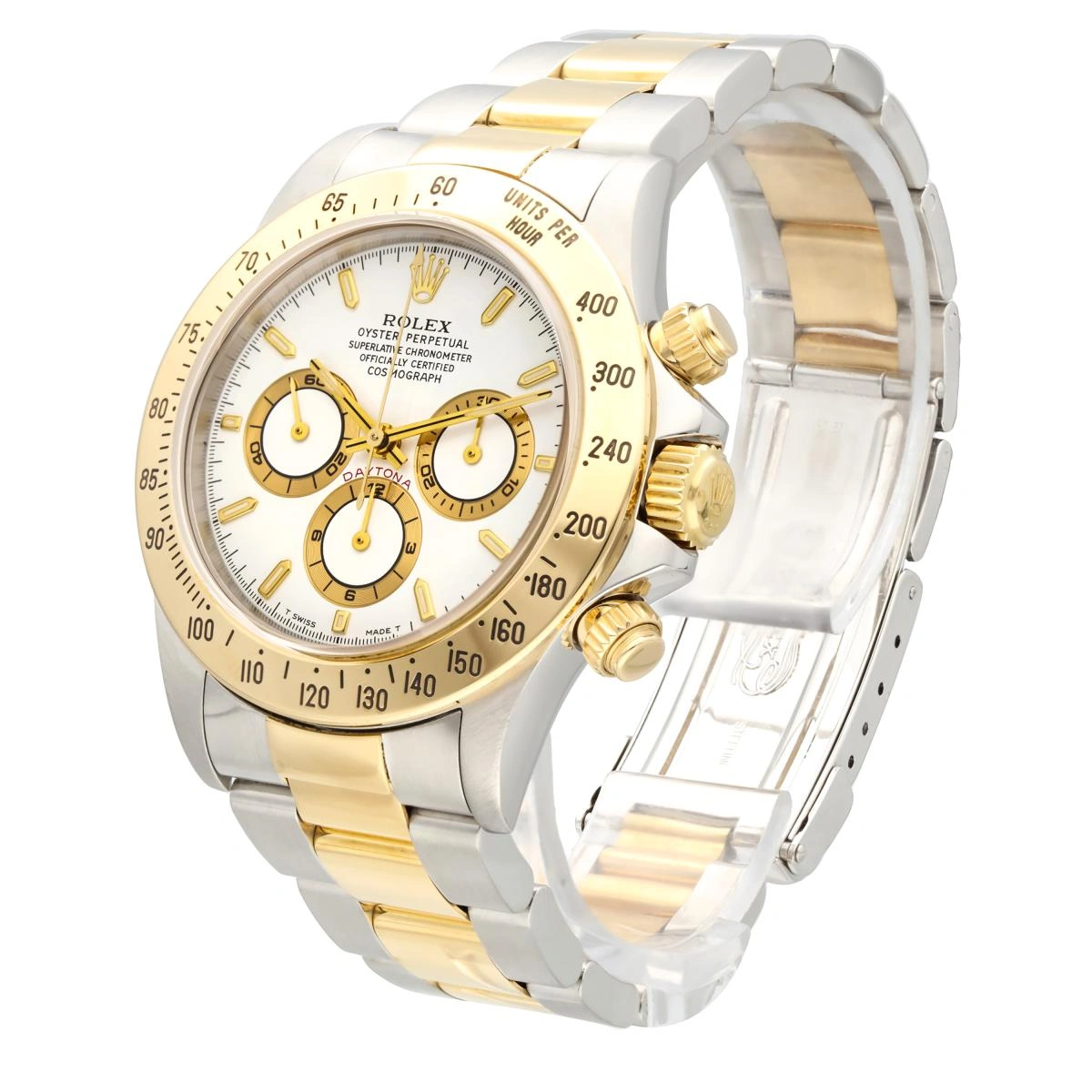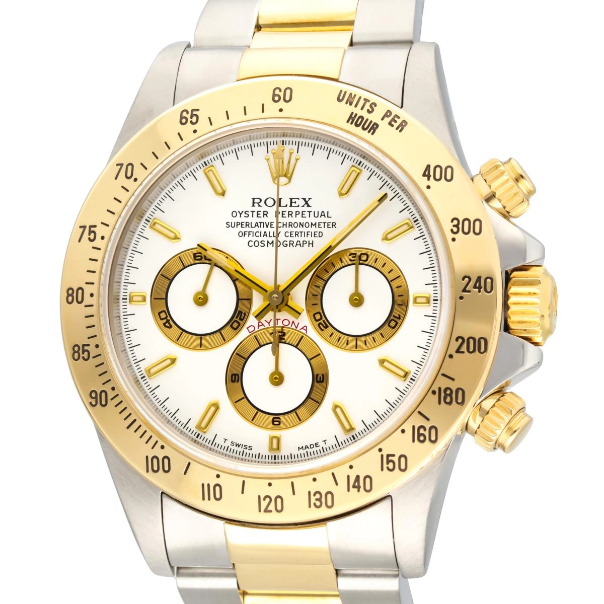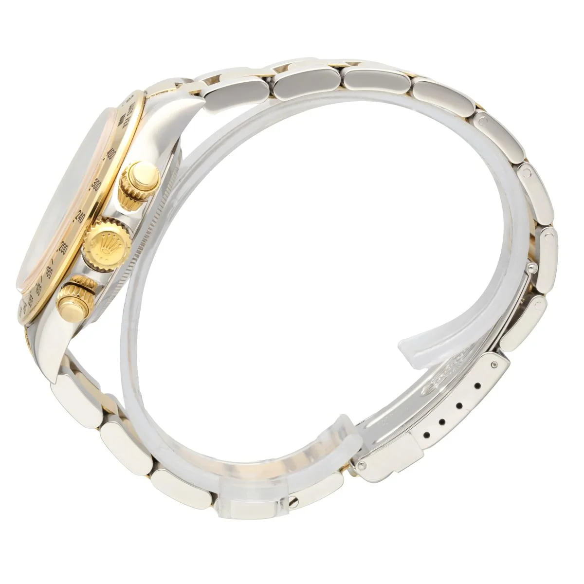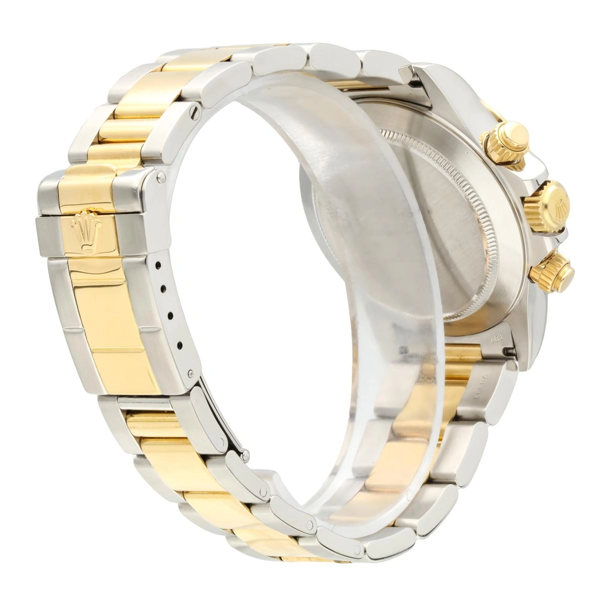 Rolex Cosmograph Daytona ref 16523 in yellow gold and stainless steel. Officially certified, self-winding chronometer with a chronograph "El Primero" movement Caliber 4030. Before Rolex brought production of the Daytona movement in-house, the Big Crown outsourced it from Zenith and the company's celebrated "El Primero" mechanical movement. Today, all Rolex chronograph movements are developed and produced entirely in-house, making this discontinued Rolex ref. 16523 something of a cult-favorite among collectors in the know.