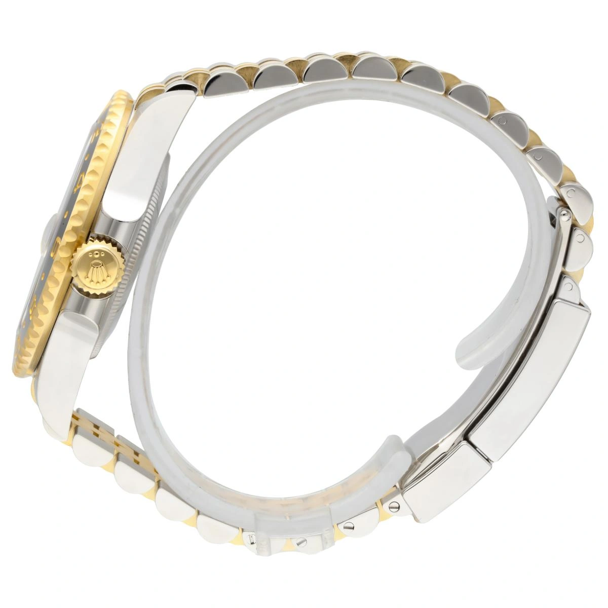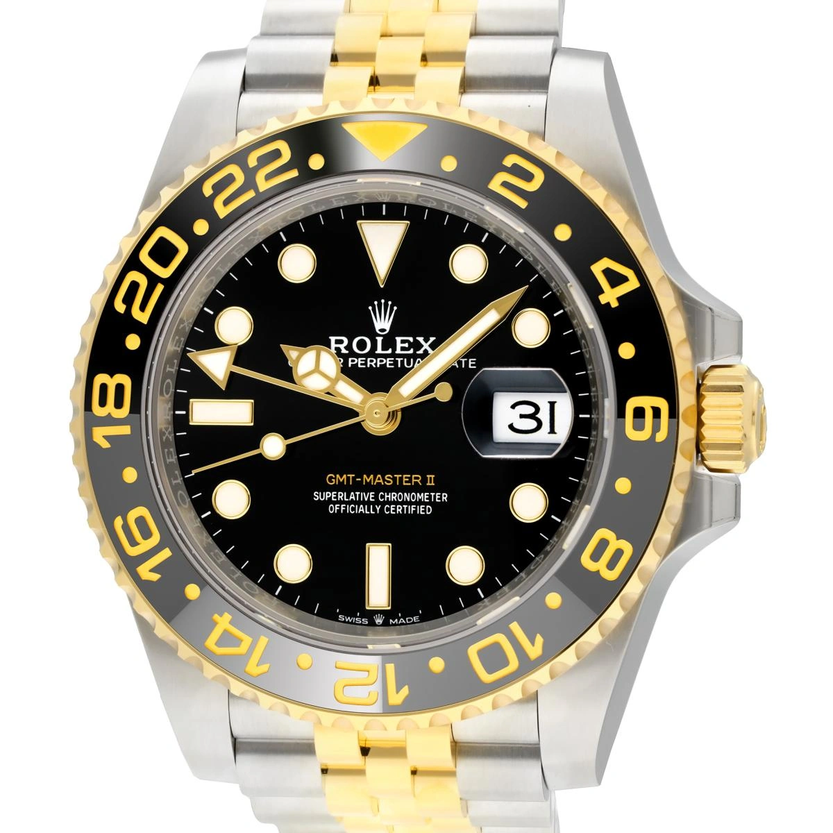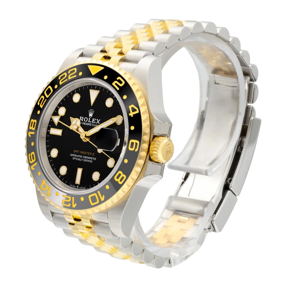 The Rolex GMT-Master II 126713GRNR-0001 of 2023 has case and bracelet done in a combination of stainless steel and yellow gold. The ceramic bezel insert is executed in grey and black ceramic. This model features a black dial and a two-colour Cerachrom bezel insert in grey and black ceramic. In addition to conventional hour, minute and seconds hands, the GMT-Master II features an arrow-tipped hand, which circles the dial once every 24 hours, as well as a bidirectional rotatable 24-hour graduated bezel.