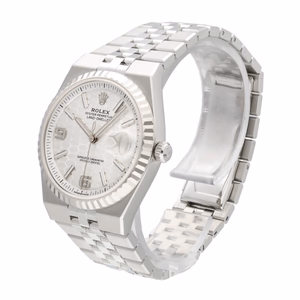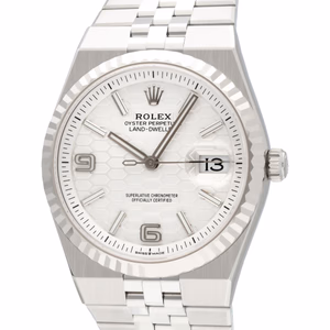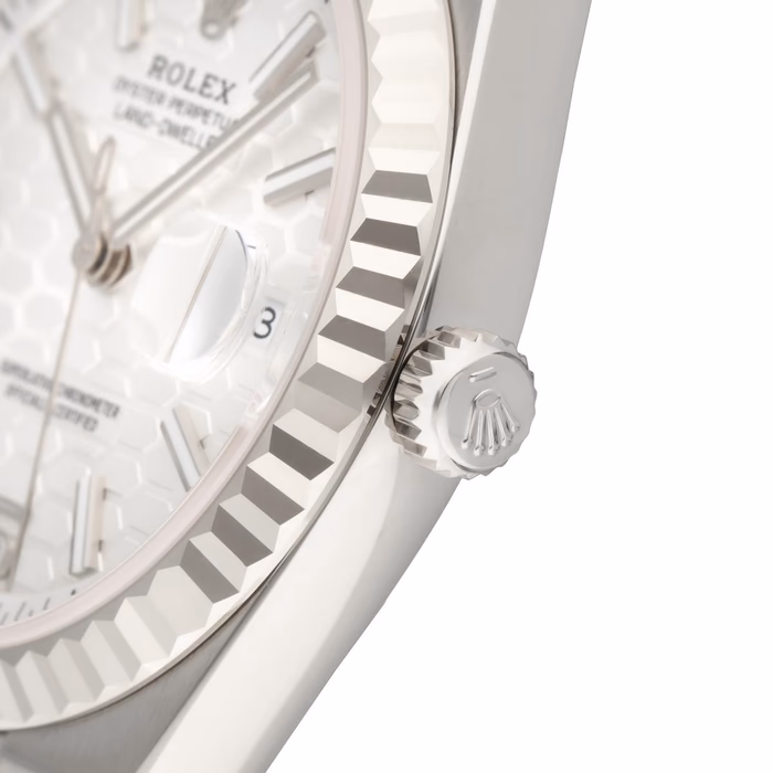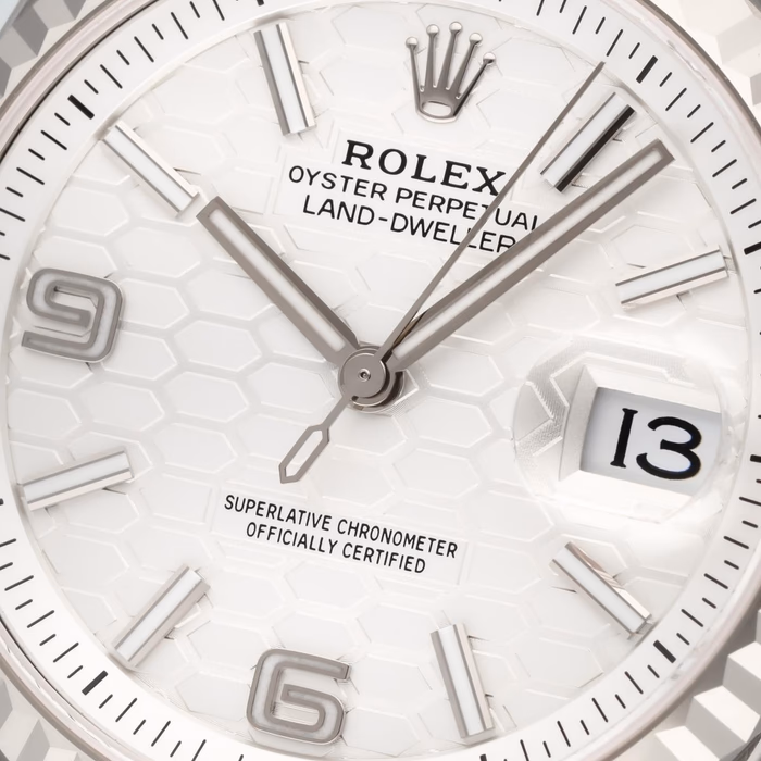 The Rolex Land-Dweller 36 127234-0001 debuted in 2025. This watch has a stainless steel case with a fluted white gold bezel, and an integrated 'Flat Jubilee' bracelet. The Land-Dweller 36 has an intense white, honeycomb-motif dial and Flat Jubilee bracelet.