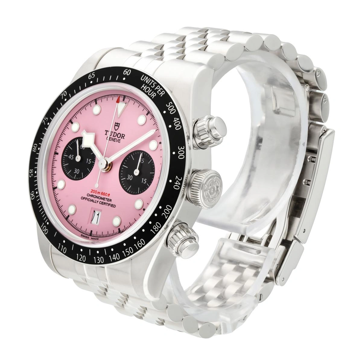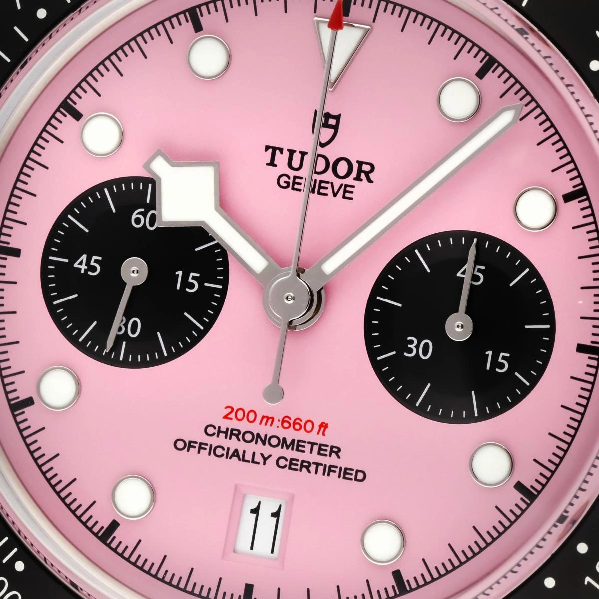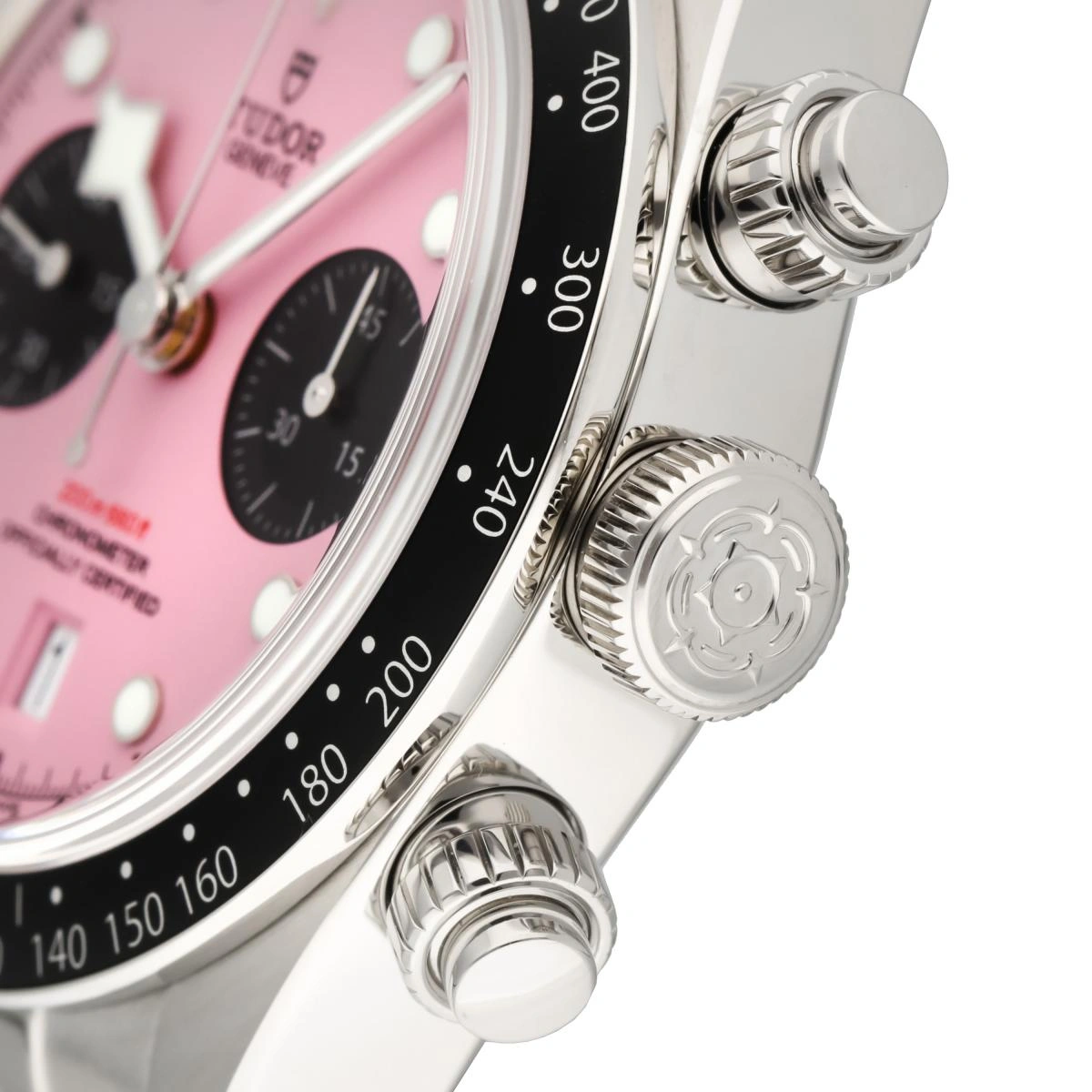 The Tudor Black Bay Chrono reference M79360N-0019 was introduced in 2024. This BB Chrono has a Stainless Steel case of 41.00mm, with a black anodised aluminum tachymeter insert. The dial is pink - a reference to various Tudor ambassadors & other supported ventures, such as Jay Chou (favorite color), the Giro d'Italia (leader's jersey) and Inter Miami CF.