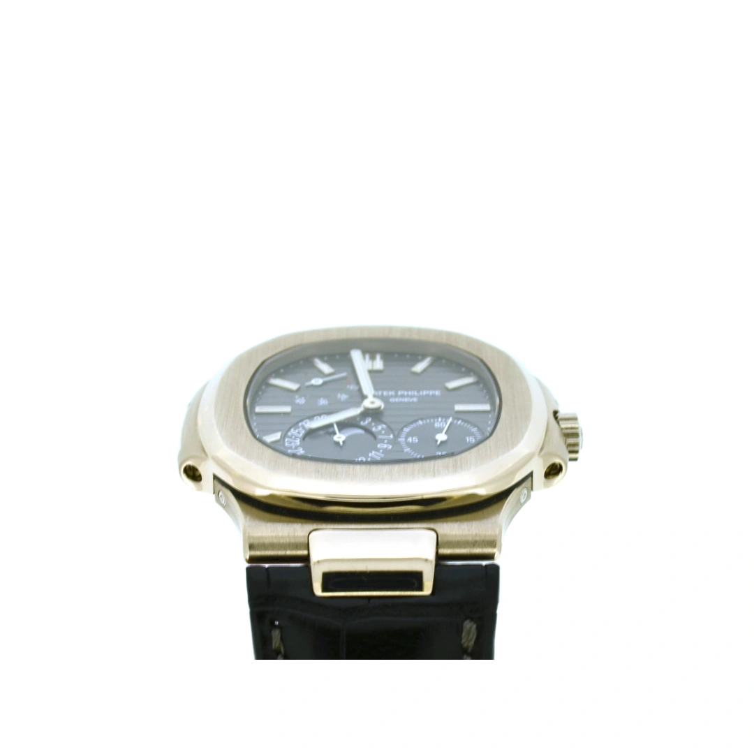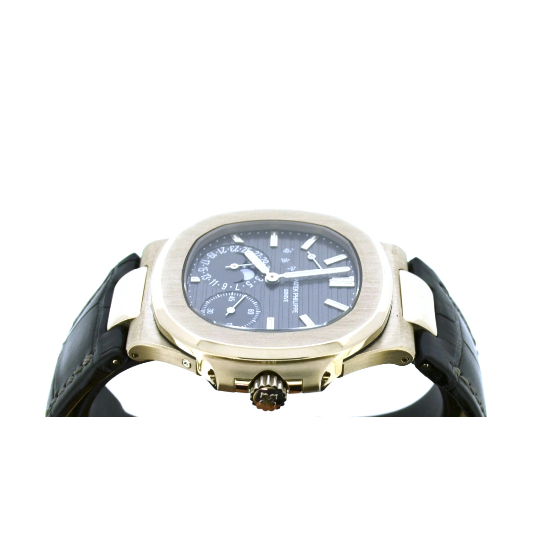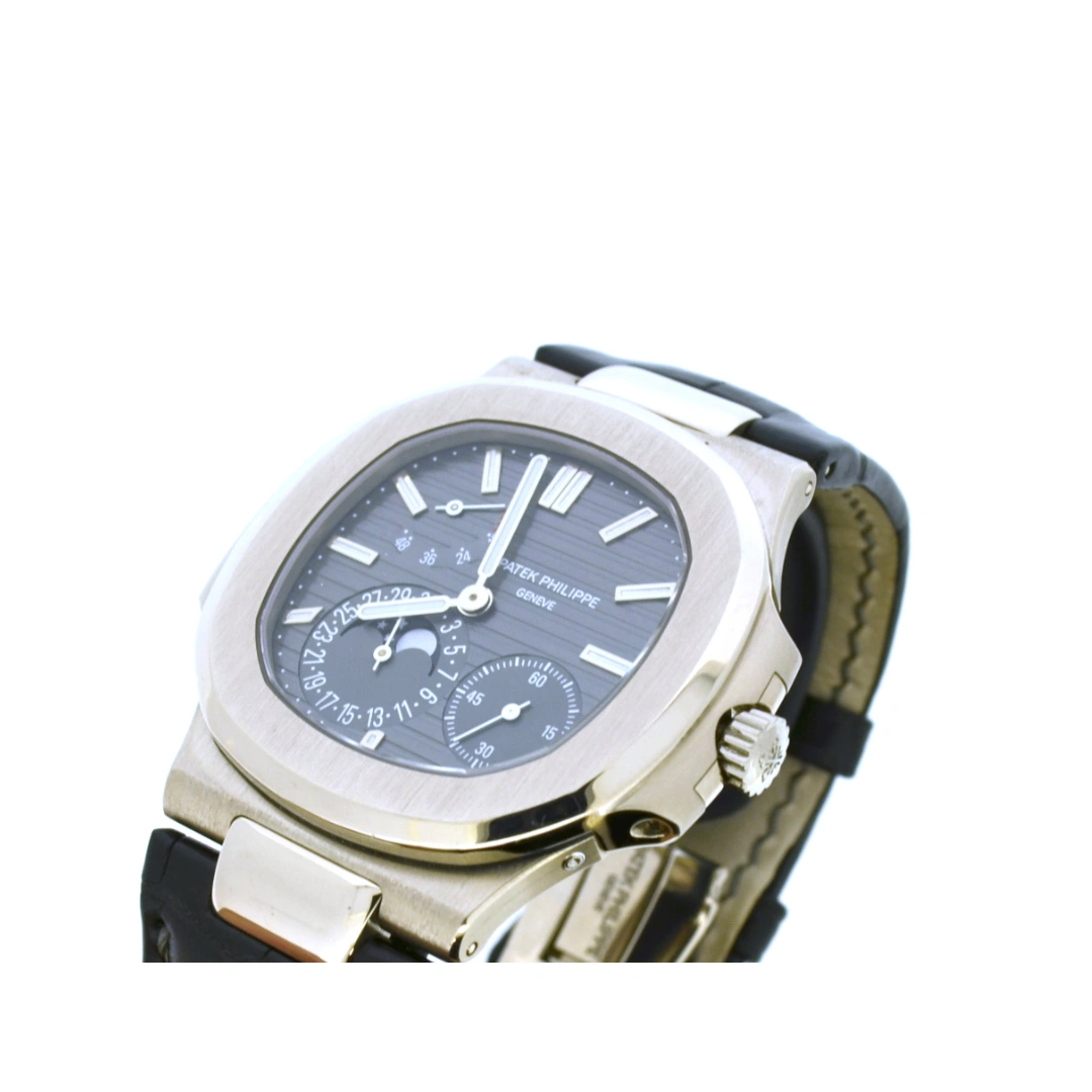This Nautilus 5712 has a white gold case with a matching slate grey dial. The dial shows hours, minutes, small seconds, date, moonphase and a power reserve indicator.