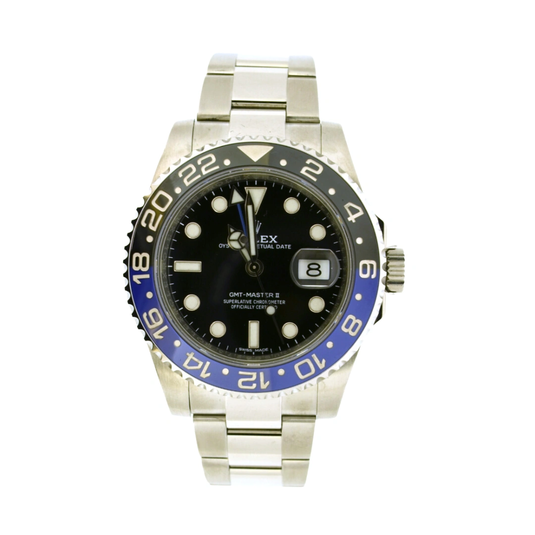 Introduced in 2013, the GMT-Master II BLNR uses a distinct Black/ Blue (or 'Day & Night') bezel in ceramic. It is powered by caliber 3186.