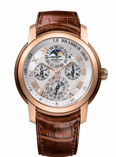 The Jules Audemars reference 26003OR.OO.D088CR.01 has a pink gold case (43mm) and a silver dial with Roman numerals. It is powered by the selfwinding caliber 2120 with module 2808 - the latter provides it with a perpetual calendar with equation of time, and sunrise & -set times.