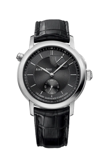 The Jules Audemars 26344PT.OO.D002CR.02 is a unique piece created for The Hour Glass. It features a platinum case and a black guilloché dial. It is powered by the hand-wound caliber 2945, which features a triple tone grande sonnerie, smalls seconds and a power reserve indicator.