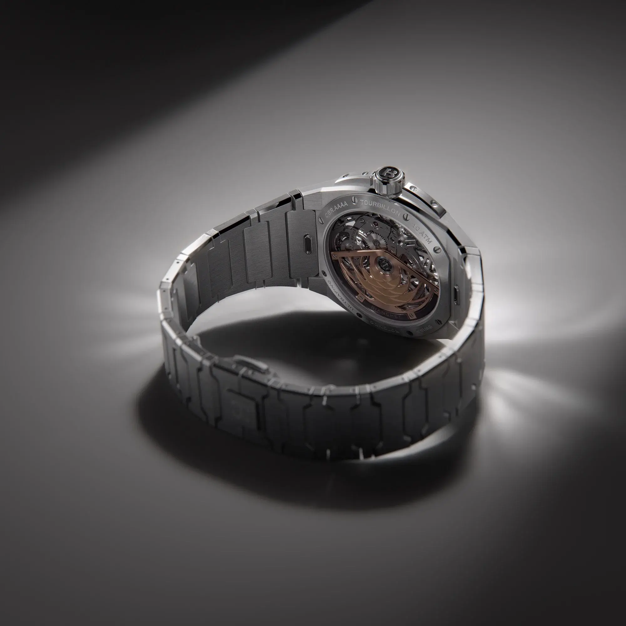 The Bianchet Rotondo Ultrafino Titanium Ref. RDUFFTSKTNBK is a 39 mm automatic flying tourbillon, with its sharp edges and clean bezel in deliberate contrast with the open-worked movement within. Lightweight and precisely proportioned, it delivers exceptional comfort and uncompromised performance. Weight 75 grams. Additional rubber strap with titanium folding clasp included.