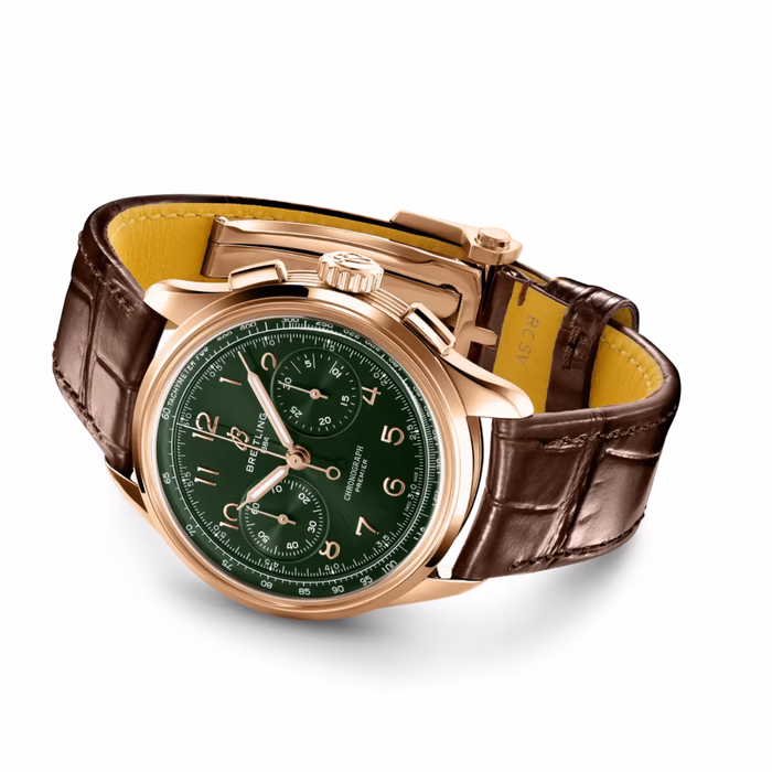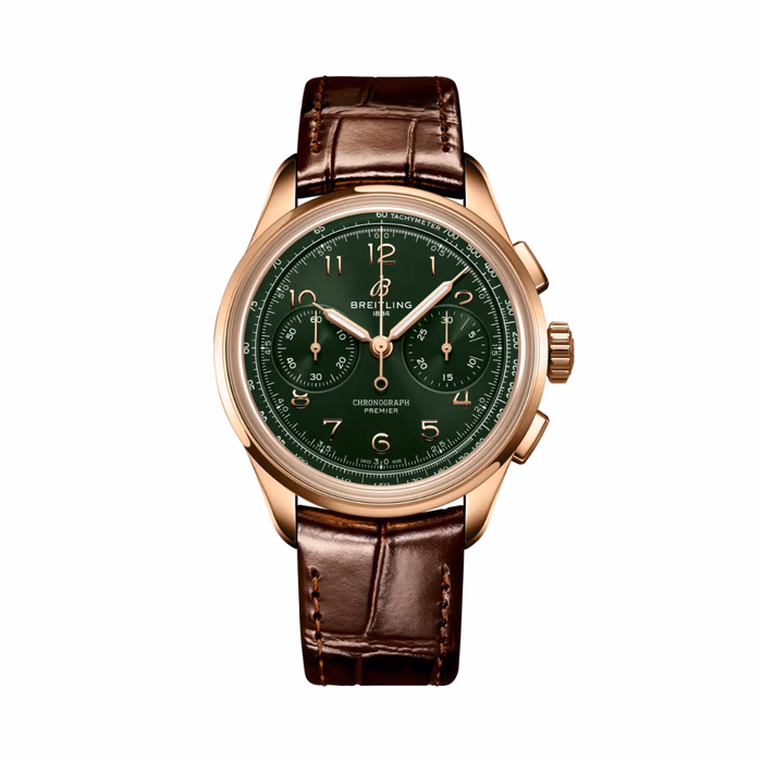 The Breitling Premier B09 Chronograph 40 RB0930361L1P1 is fitted with a brown alligator leather strap and an 18 k red gold folding clasp. The watch has a 40 mm case in 18 k red gold with a thickness of 13.08 mm. It features rectangular chronograph pushers, a fixed bezel, and a cambered sapphire crystal glareproofed on both sides. The sapphire crystal case back is secured by screws. Water resistance is 10 bar (100 meters). The green dial is finished with Arabic numerals and two recessed subdials in a symmetrical layout. Inside, the hand-wound Breitling Caliber B09 and provides a power reserve of approximately 70 hours.