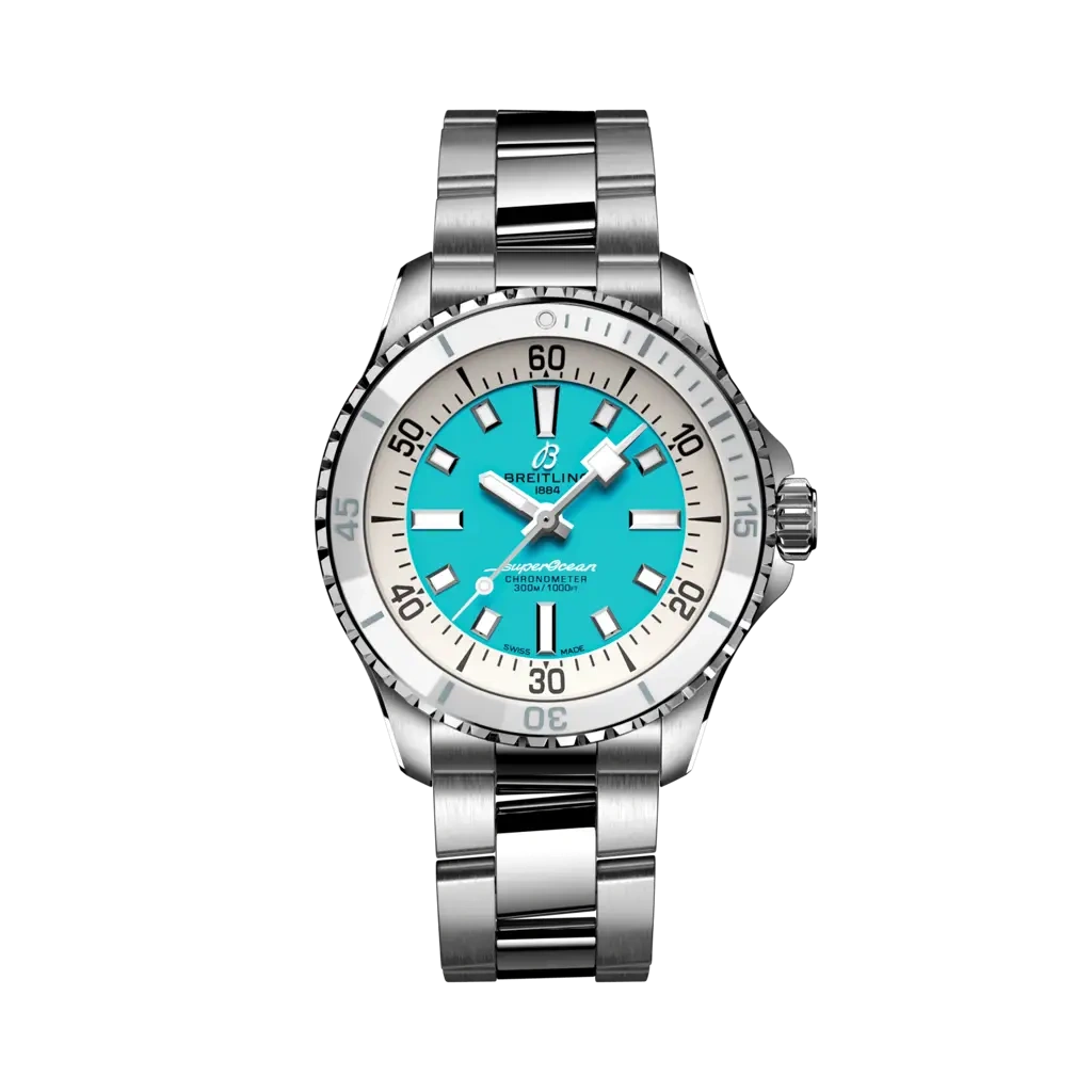 The Breitling SuperOcean Automatic A17377211C1A1 debuted in 2022 as part of a renewed SuperOcean collection inspired by the 'Slow Motion' of the 1960's. This version has a case of 36.00mm with a ceramic bezel insert, and a Turquoise dial. The movement within is Breitling's trusted caliber Caliber 17 ND.
