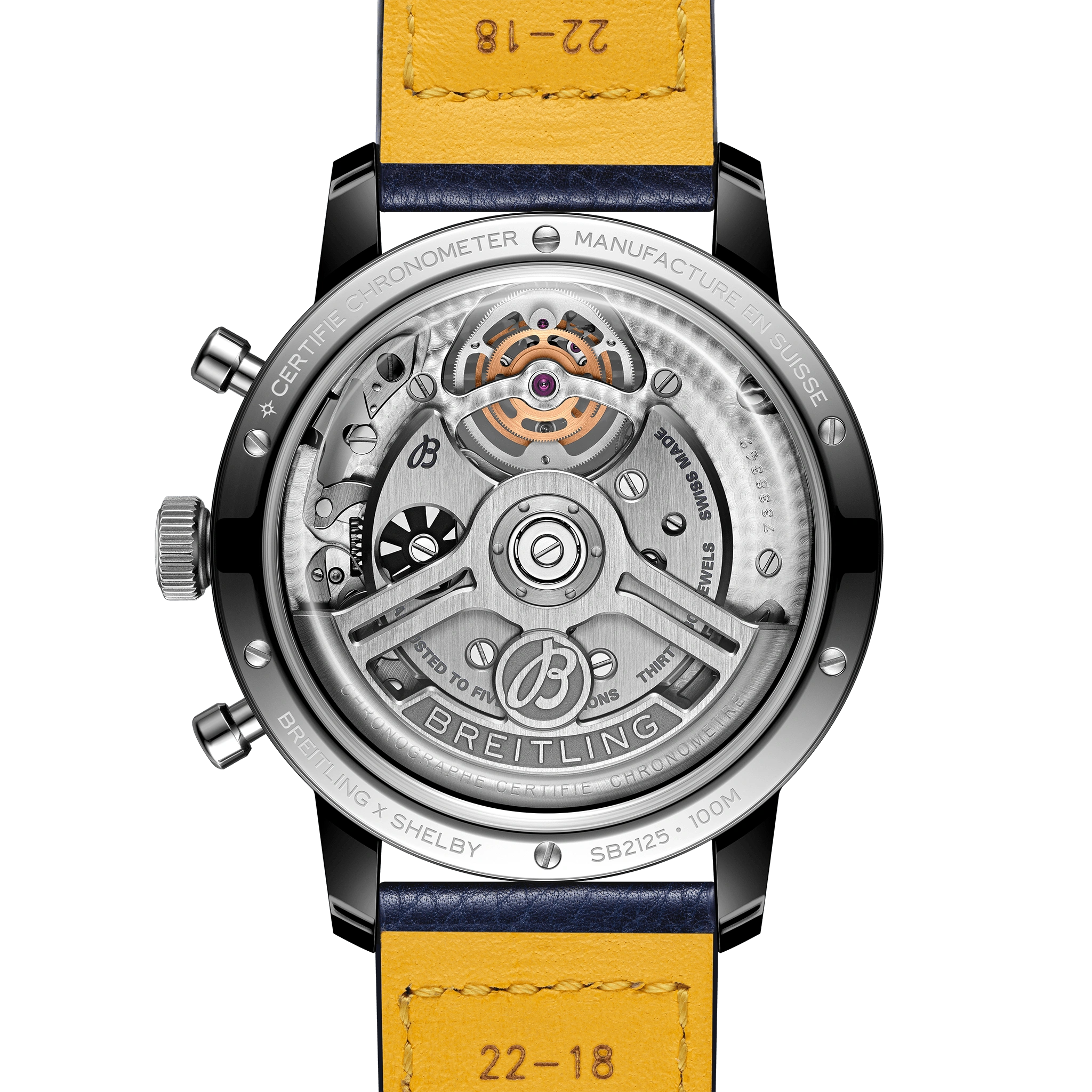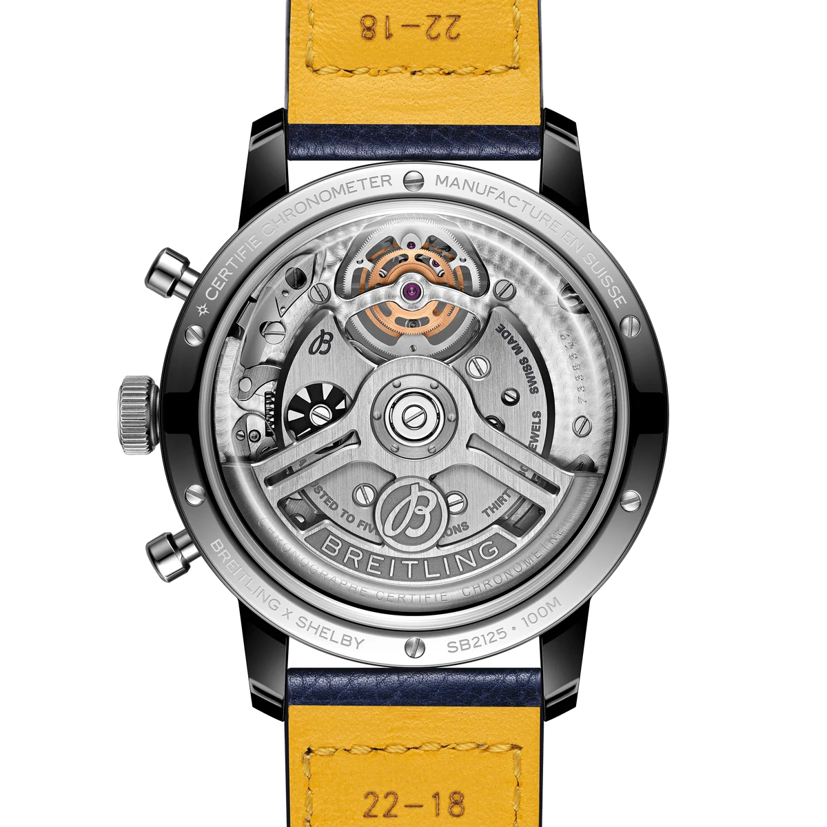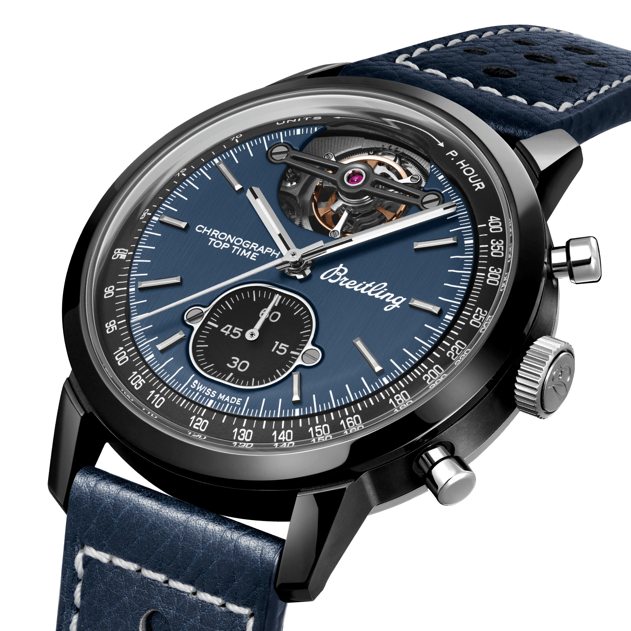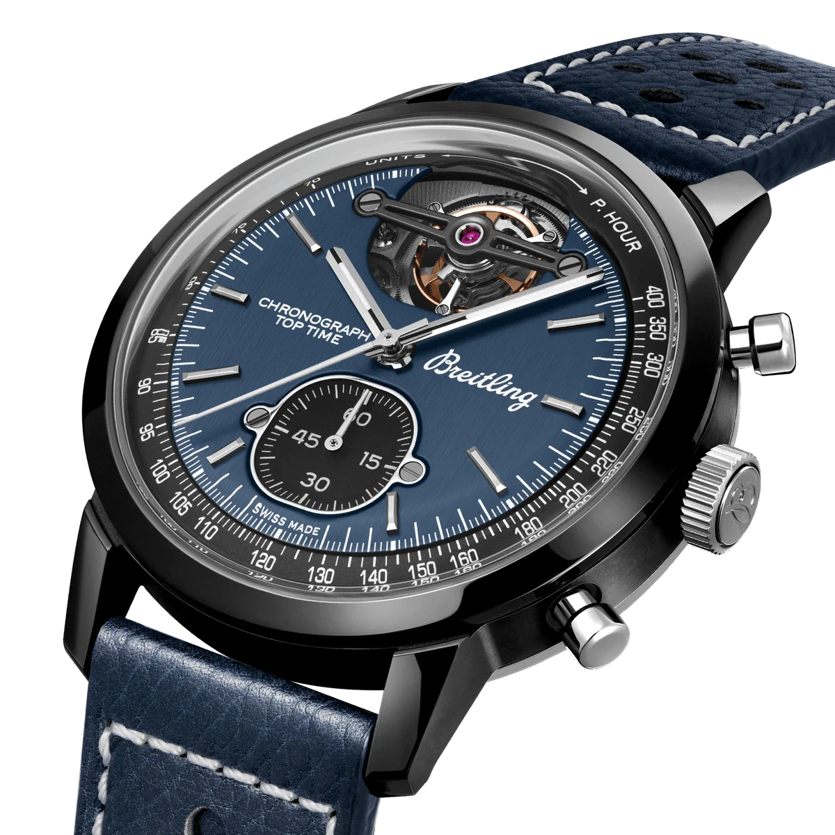 Introduced in 2023, the Breitling Premier Top Time reference SB21251A1C1X1 is part of a 'Capsule' collection of watches paying hommage to the world of classic cars. This watch has a black ceramic & titanium case and a blue dial; inside ticks the Caliber B21, a self-winding movement with tourbillon and chronograph.