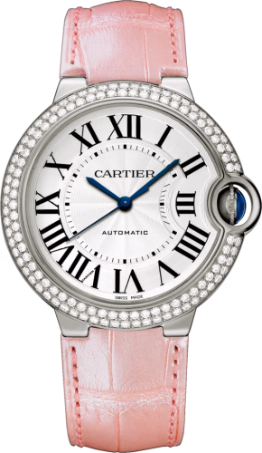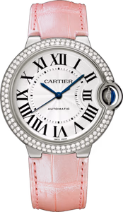 The Cartier Ballon Blue line was introduced in 2007. It features a smooth, pebble-like case. One of its signature elements is the recessed & protected crown and the 'dent' it causes in the dial. Reference WJBB0011 has a white gold case with diamond-set bezel and a silver dial. It is powered by the self-winding caliber 049 (no date) and fitted with a leather strap.