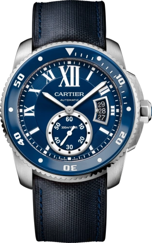 The Calibre de Cartier Diver was introduced in late 2013, with the first watches being commercially available in 2014. With the Diver, the Calibre de Cartier design is paired elegantly with ISO-compliant divers specifications. Reference WSCA0010 has a stainless steel case and a ceramic bezel. Both dial and leather strap are blue.