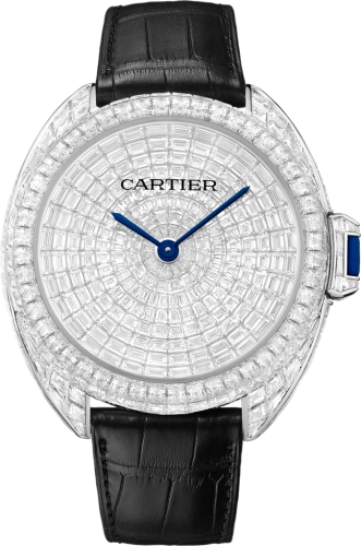 The Clé de Cartier was introduced at SIHH 2015. The case, available in a number of sizes, has a soft profile somewhere in between 'round' and 'cushion'. While at first glance the look is not unlike watches from the late sixties and early seventies, both details and finish are distinctively modern and Cartier. It's name is a reference to the clever locking system of the crown - the 'key'. Reference HPI00938 has a white gold case set with 180 baguette-cut diamonds totalling 8.70 carats and 48 scissor-cut diamonds totalling 4.45 carat. The white gold dial is set with 224 baguette-cut diamonds totalling 6.60 carats. The white gold folding buckle is set with an additional 37 baguette-cut diamonds totalling 0.85 carats.