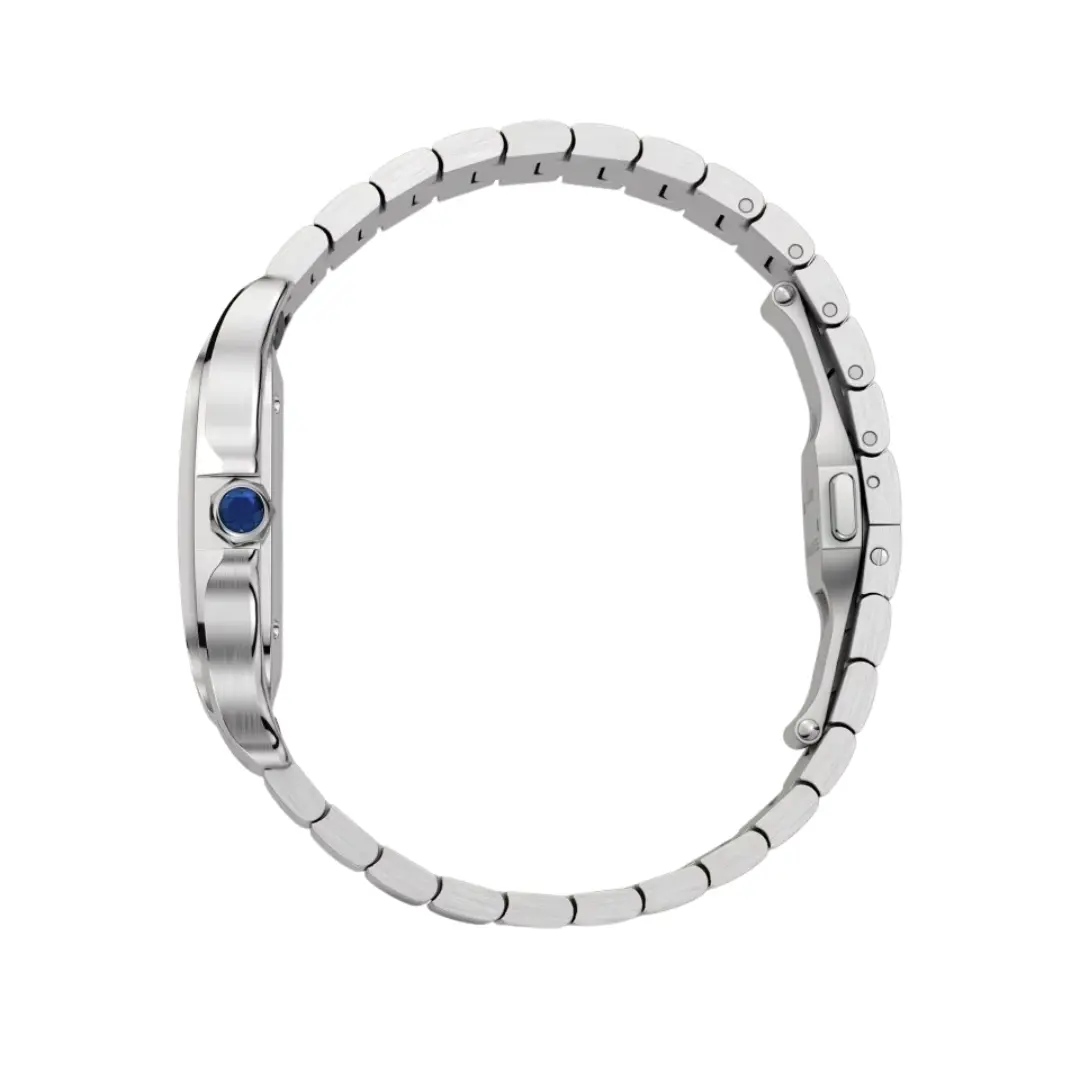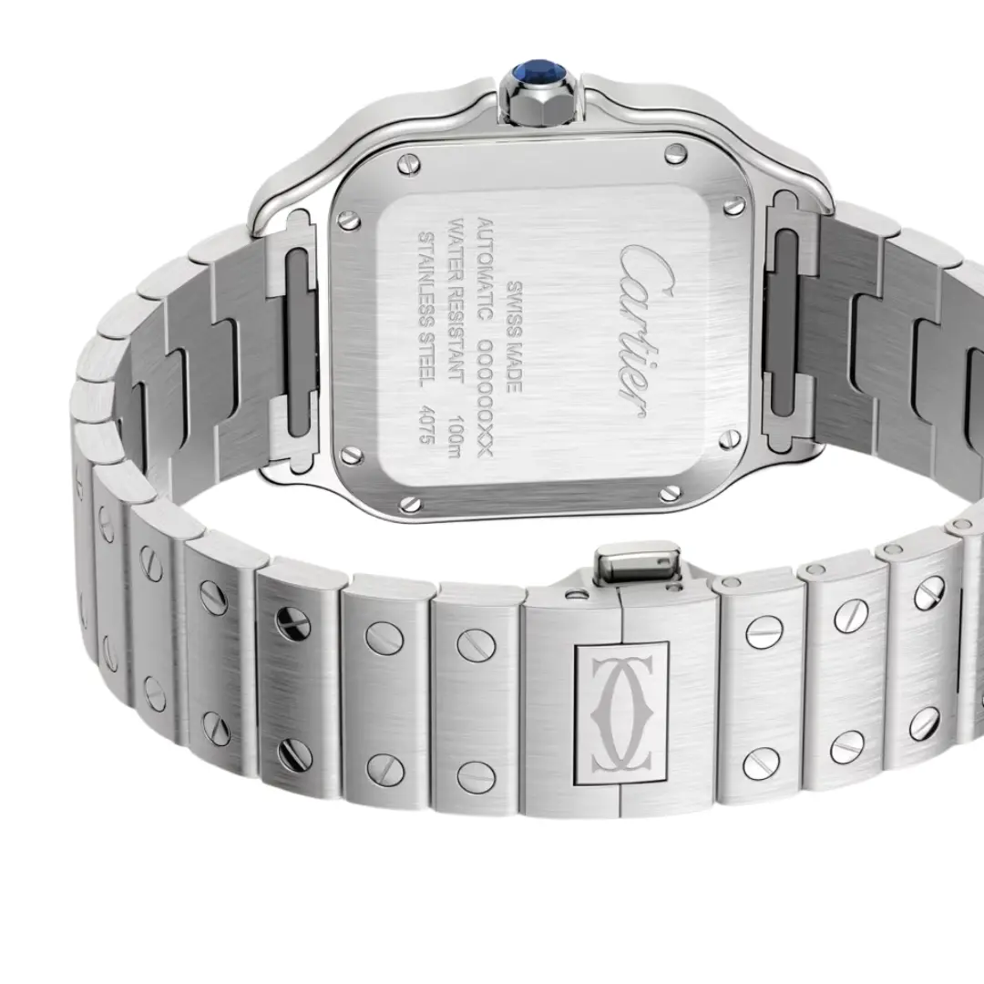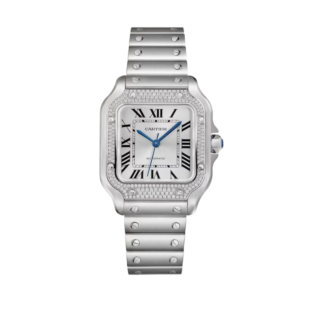 Cartier Santos de Cartier W4SA0005 watch, medium model, mechanical movement with automatic winding, caliber 1847 MC. Steel case, steel bezel set with 206 brilliant-cut diamonds totaling 0.64 carats. Seven-sided crown set with a faceted synthetic spinel, sunray dial, blued-steel sword-shaped hands, sapphire crystal. Steel bracelet with “SmartLink” adjustment system. Second bracelet in calfskin, with steel interchangeable deployant buckle. Case width: 35.1 mm, thickness: 8.83 mm. Water-resistant up to 10 bar (approx. 100 meters/330 feet).