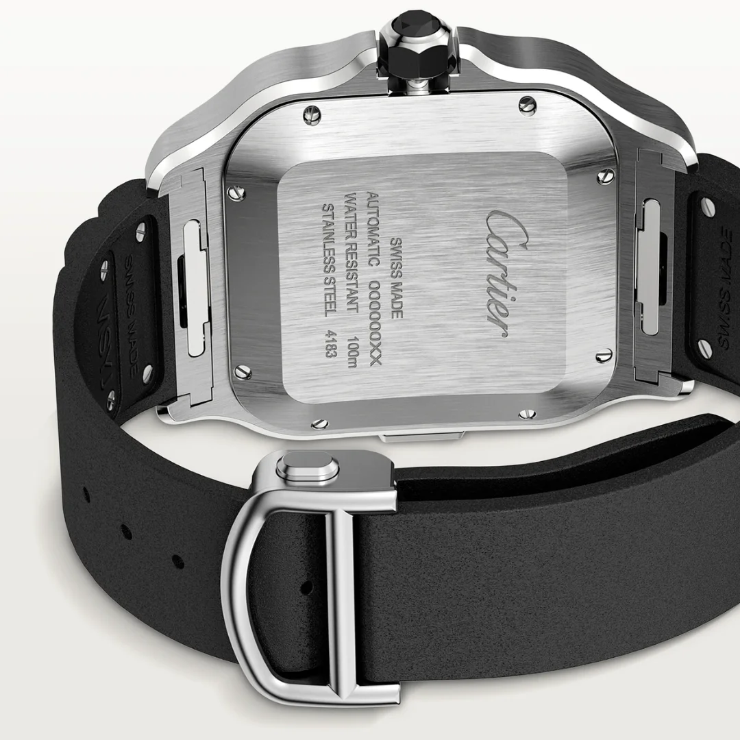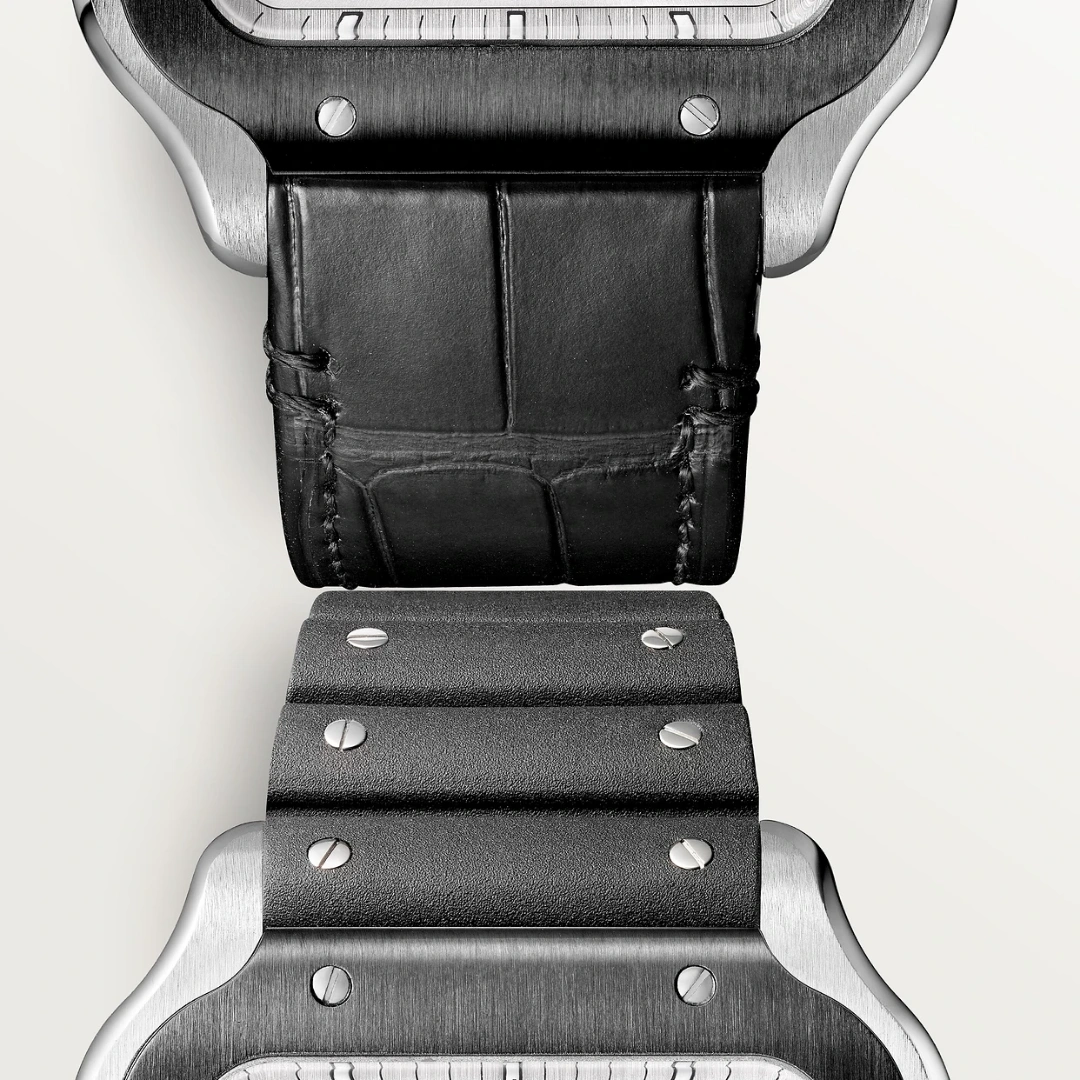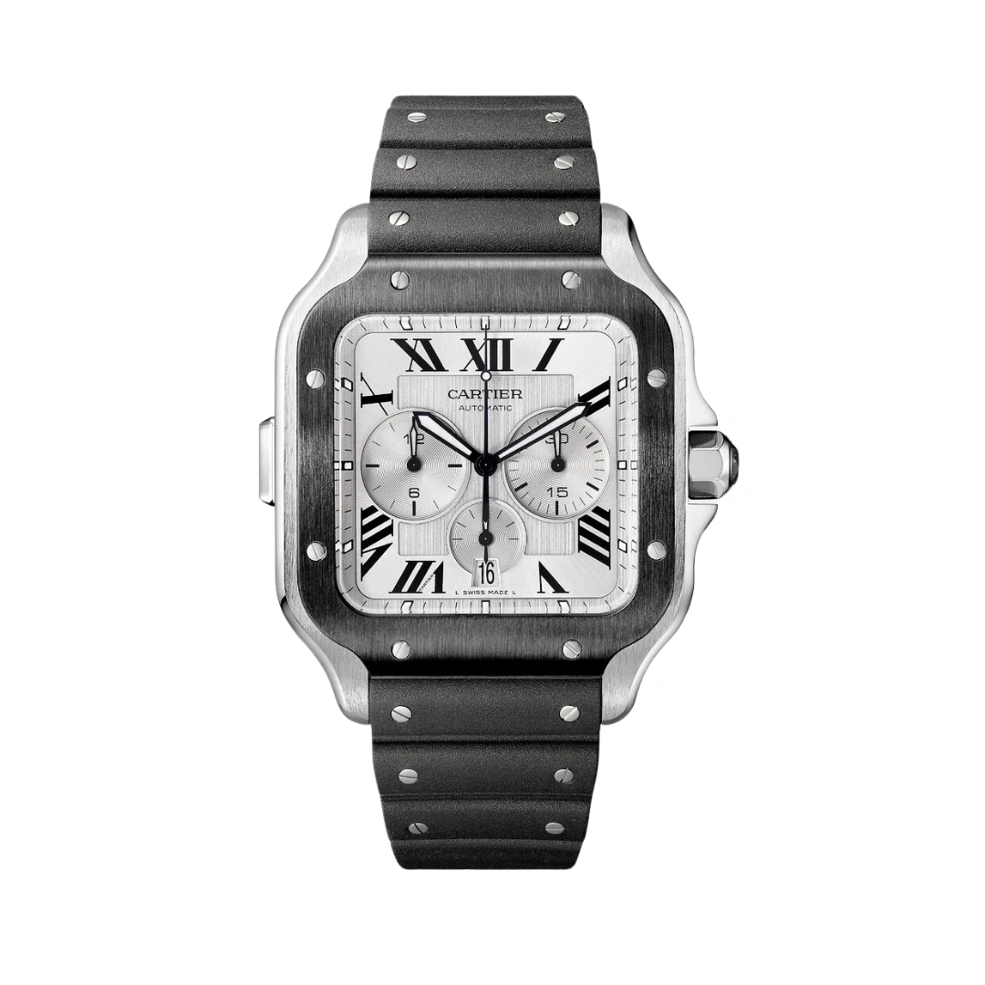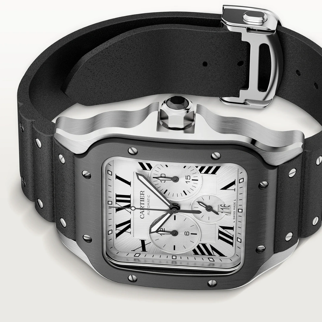 Santos watch, extra large model, chronograph mechanical movement with automatic winding, calibre 1904 CH MC. Steel case, ADLC bezel, 7-sided crown set with a faceted black synthetic spinel, satin-brushed silvered dial, black steel sword-shaped hands with luminescent material, sapphire crystal. First bracelet in rubber, second in black “Gomma” alligator skin, with steel folding buckle. Both bracelets are fitted with the “QuickSwitch” interchangeability system. Case width: 43.3 mm, case thickness: 12.4 mm. Water-resistant to 10 bar (approx. 100 metres).