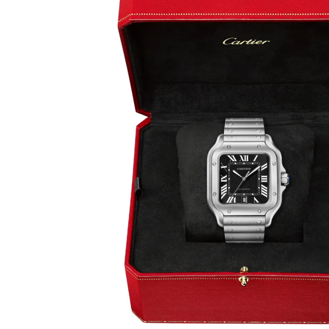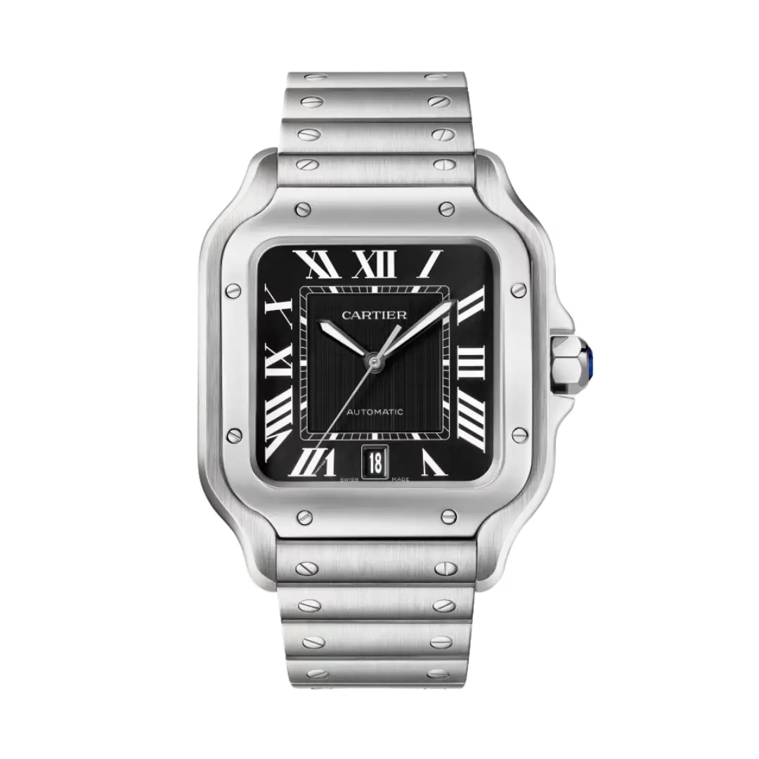 Cartier Santos de Cartier WSSA0096 watch, large model, mechanical movement with automatic winding, caliber 1847 MC. Steel case, 7-sided crown set with a synthetic faceted spinel, black dial, black steel sword-shaped hands with luminescent material, sapphire crystal. Steel bracelet with "SmartLink" adjustment system. Second strap in nubuck alligator leather, with interchangeable steel deployant buckle. Dimensions: 47 x 39.8 mm. Thickness: 9.4 mm. Water-resistant up to 10 bar (approx. 100 meters/330 feet).
