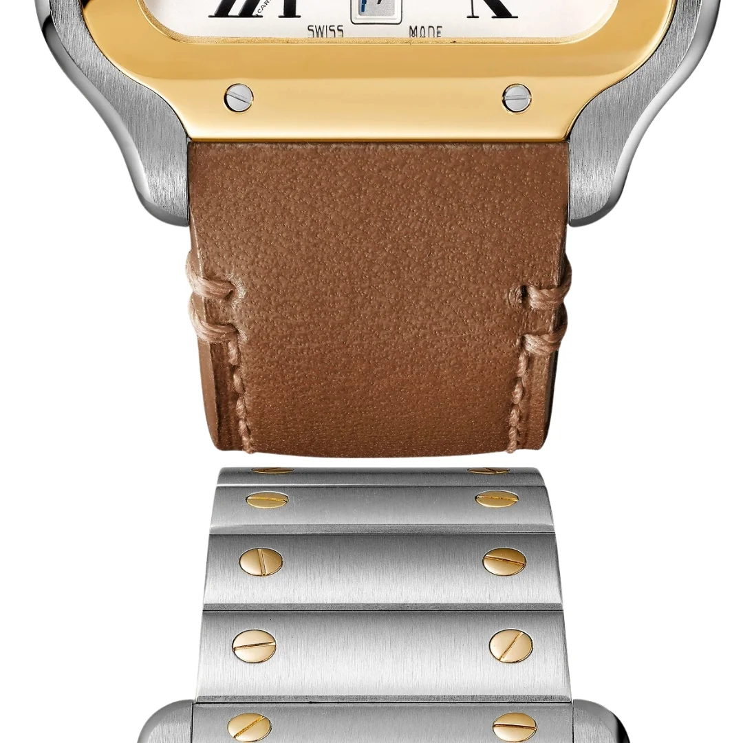 Santos watch, large model, mechanical movement with automatic winding, calibre 1847 MC. Steel case and yellow gold 750/1000 bezel, 7-sided crown set with a faceted synthetic spinel, silvered opaline dial, blued-steel sword-shaped hands, sapphire crystal. Steel bracelet with “SmartLink” adjustment system. Second bracelet in calfskin, with interchangeable steel folding buckle. Both bracelets are fitted with the “QuickSwitch” interchangeability system. Case width: 39.8 mm, thickness: 9.38 mm. Water-resistant to 10 bar (approx. 100 meter).