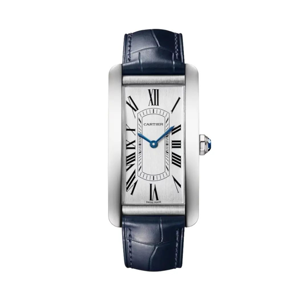 Cartier Tank Américaine WSTA0083 watch, large model, mechanical movement with automatic winding. Steel case, faceted crown with a faceted synthetic blue spinel. Silvered satin-brushed dial, blued-steel sword-shaped hands, sapphire crystal. Case dimensions: 44.4 mm x 24.4 mm, thickness: 8.6 mm. Water-resistant up to 3 bar (approx. 30 meters/100 feet).