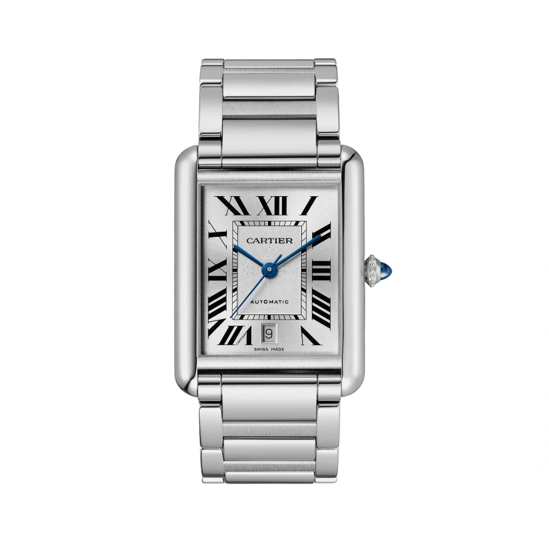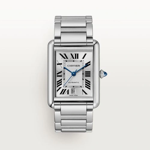 Tank Must watch, extra-large model, mechanical movement with automatic winding, calibre. Steel case, beaded crown set with a synthetic cabochon-shaped spinel, silvered flinqué dial, blued-steel sword-shaped hands, steel bracelet, calendar aperture at 6 o'clock. Case dimensions: 41 mm x 31 mm, thickness: 8.4 mm. Water-resistant to 3 bar (approx. 30 meter).