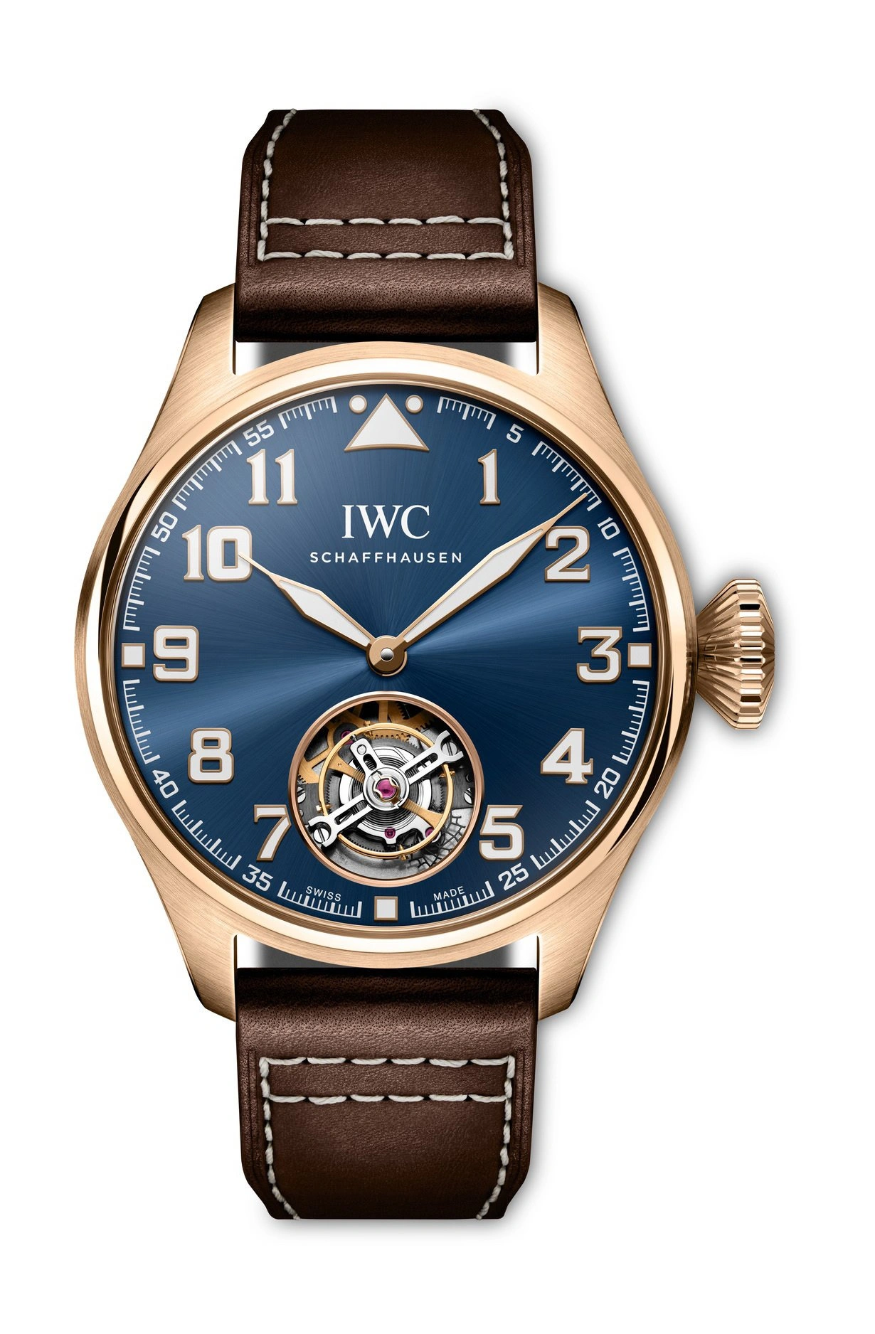 Introduced in 2023, the IWC Big Pilot 43 reference IW329502 has a 18ct Armor Gold case of 43.00mm and a Blue dial. Inside ticks caliber 82905, a self-winding movement with tourbillon. Pellaton automatic winding, Flying minute tourbillon, Sapphire glass, convex, antireflective coating on both sides, Glass secured against displacement by drop in air pressure, Hacking tourbillon mechanism, Limited to 300 pieces