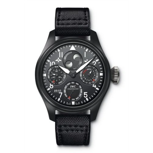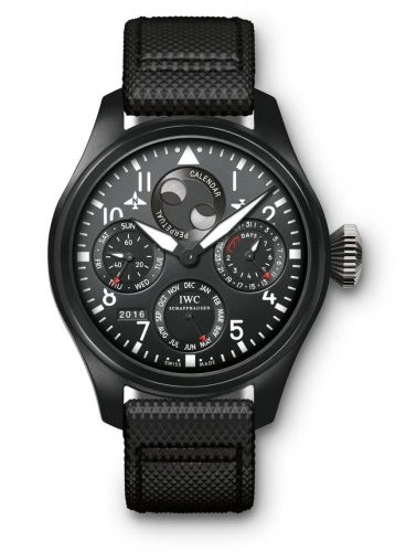 The Big Pilot’s Watch Perpetual Calendar TOP GUN (Ref. 5029) from IWC Schaffhausen comes with a wealth of complex technological features. The IWC-manufactured movement with its 7-day power reserve drives a whole range of watchmaking complications. These include a perpetual calendar with four-digit year display together with date, day and month displays as well as a moon phase display. All the displays are easily adjusted via the crown. The 2016 version of the IW5029-02 features an embossed black calfskin strap, the only real modification compared to the earlier version of the same watch.