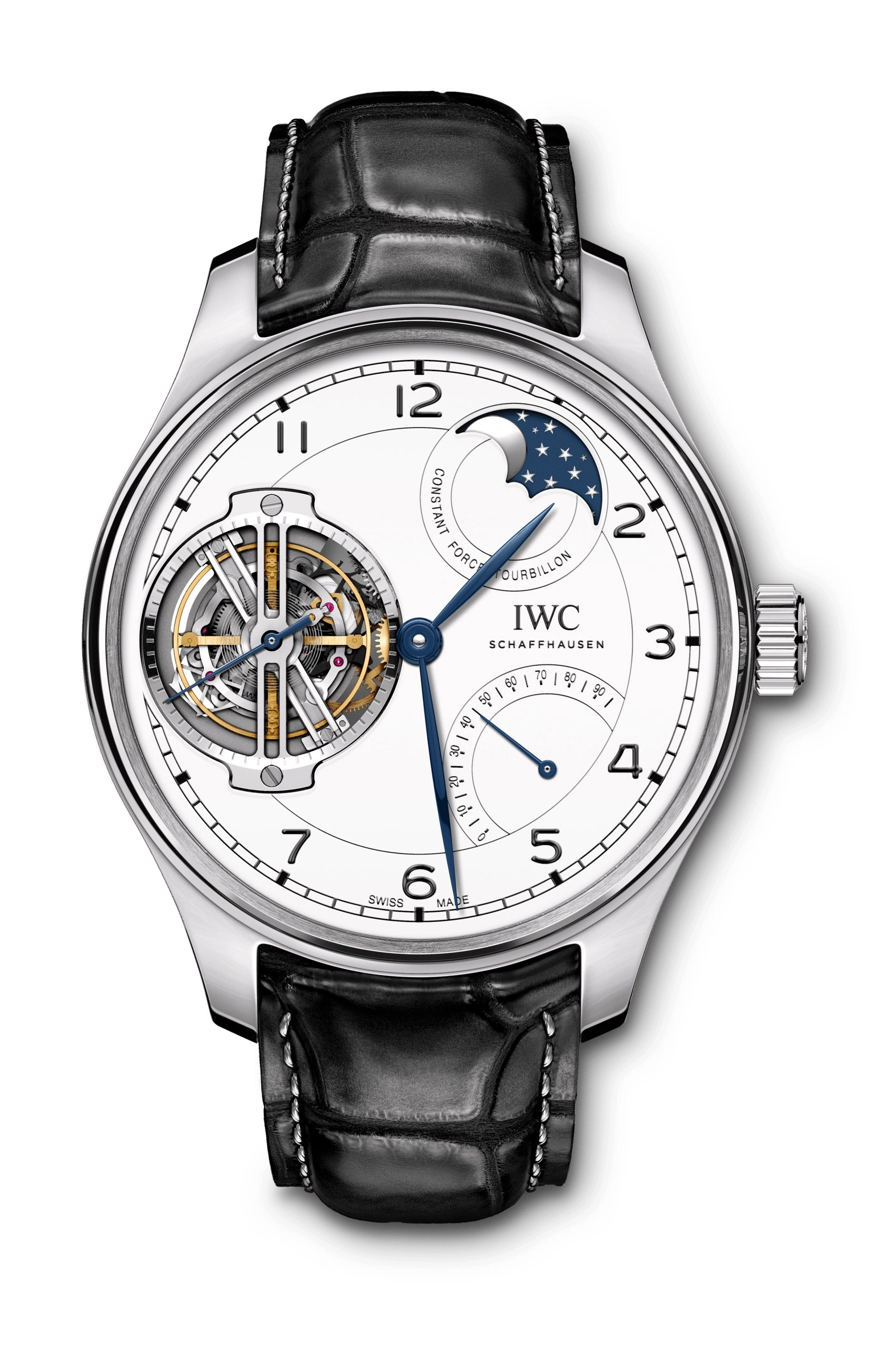 The IWC Portugieser Constant-Force Tourbillon Edition “150 Years” reference IW5902-02 is a limited edition of 15 pieces created in celebration of the brand's 150th anniversary. It features a platinum case of 46mm, which houses the hand-wound caliber 94805 with constant-force tourbillon and moonphase indicator.
