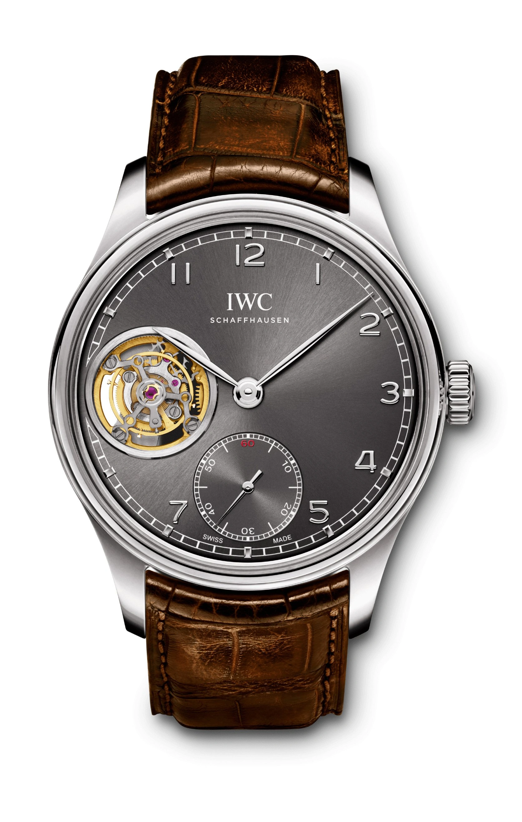In the Portuguese Tourbillon Hand-Wound, the “whirlwind” – as the word tourbillon translates – revolves on its axis at “9 o’clock” on the dial; or, in nautical terms, at 270 degrees west. The sight of the mechanical, cantilever-mounted minute tourbillon invariably attracts rapt attention from watch lovers. The tourbillon rotates around its own axis once every 60 seconds to counteract the pull of gravity on any disequilibrium in the balance wheel that would adversely affect the watch’s rate and accuracy. A new feature this year is the arched-edge front glass, which gives the watch a more classical and balanced appearance and optically reduces its height. This reference, the IW5463-01, features a white gold case with an ardoise colored dial. IT is fitted on a brown alligator strap.