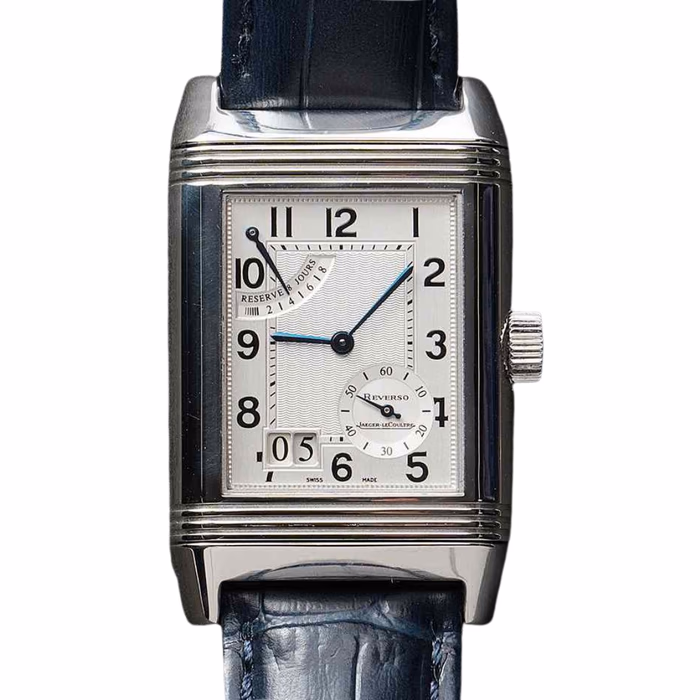 Jaeger LeCoultre Reverso Grande Date 8 Days Ref. 240.8.15 . Case size is 29 x 46 mm. This is a rare and sophisticated Neo-Vintage model. The Reverso Grande Date 8 Days, introduced around 2005, exemplifies the evolution of this classic design. It features the manually wound Caliber 875 movement, which provides an impressive 8-day power reserve. It features a double-window large date display, a small seconds sub-dial, and a power reserve indicator. The caseback displays the impressive JLC inhouse movement.