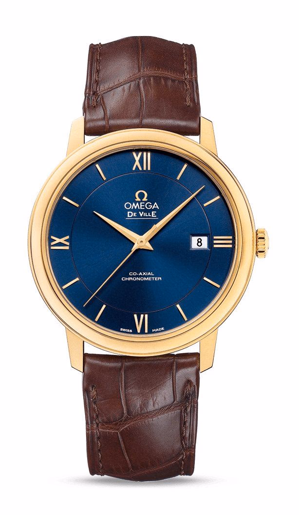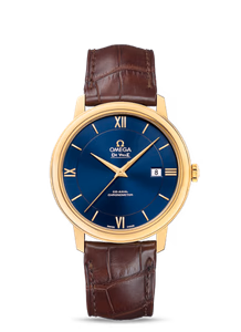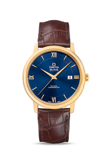 The DeVille Prestige Co-Axial reference 424.53.40.20.03.001 has a yellow gold case of 39.5mm and a blue dial. This watch is powered by the self-winding caliber 2500.