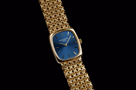 Patek Philippe Lady or Ladies Ellipse in yellow gold with a 20 mm x 23 mm case size. Manual winding movement: cal. 16-250 . Please be aware to check the size of the bracelet as it cannot be extended easily. The original blue sigma dial is stunning, retaining its rich color and perfect balance. The integrated woven bracelet, crafted by the renowned Genevan artisan Jean-Pierre Ecoffey.