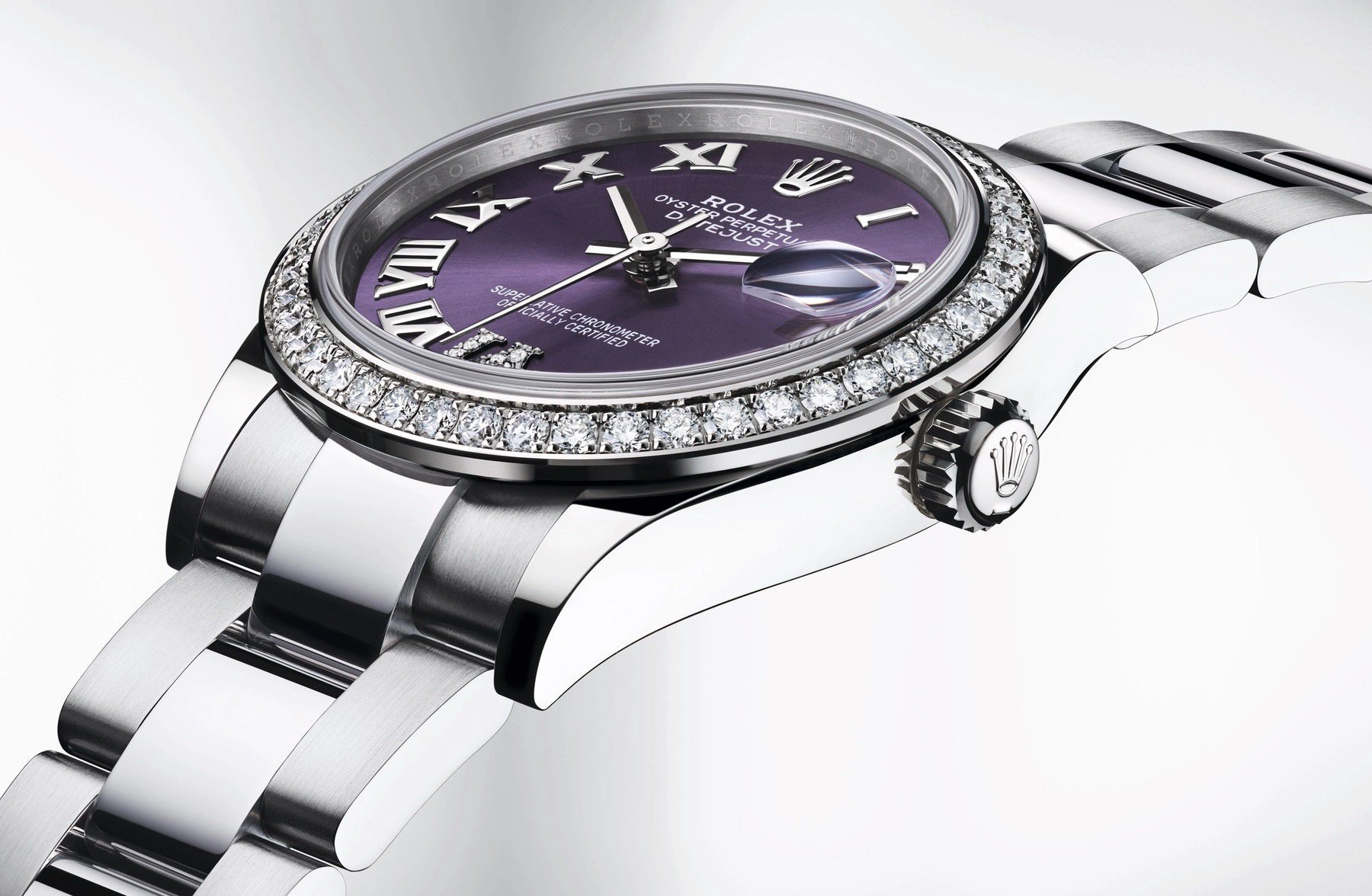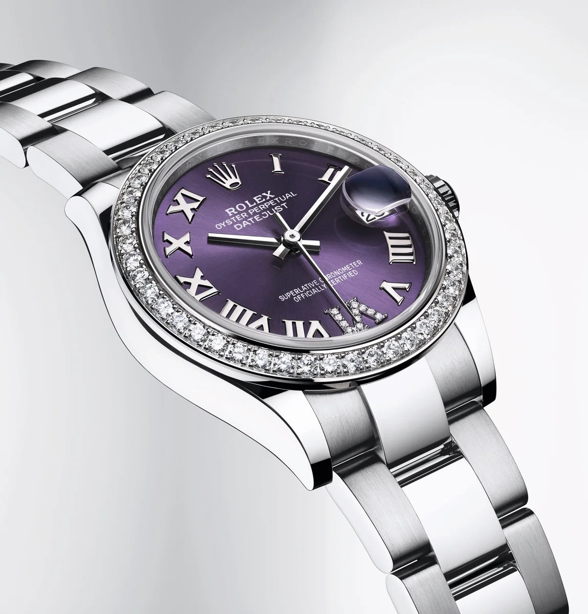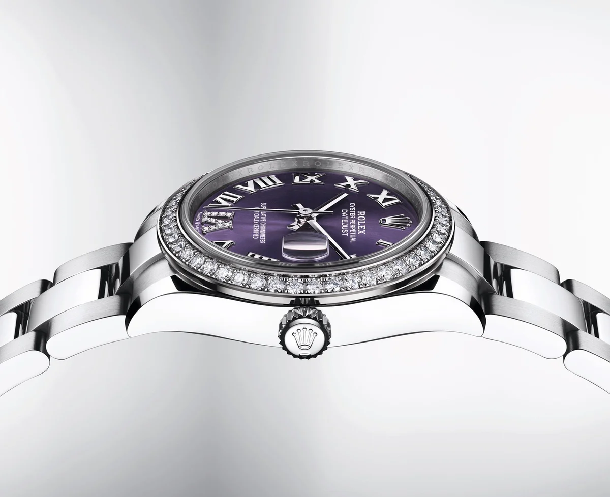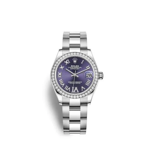 The Rolex Oyster Perpetual 31 reference 278384rbr-0029 was introduced in 2020. This watch has a stainless steel case (31.00mm) with white gold, diamond-set bezel, which holds the self-winding caliber 2236. The dial is Purple.