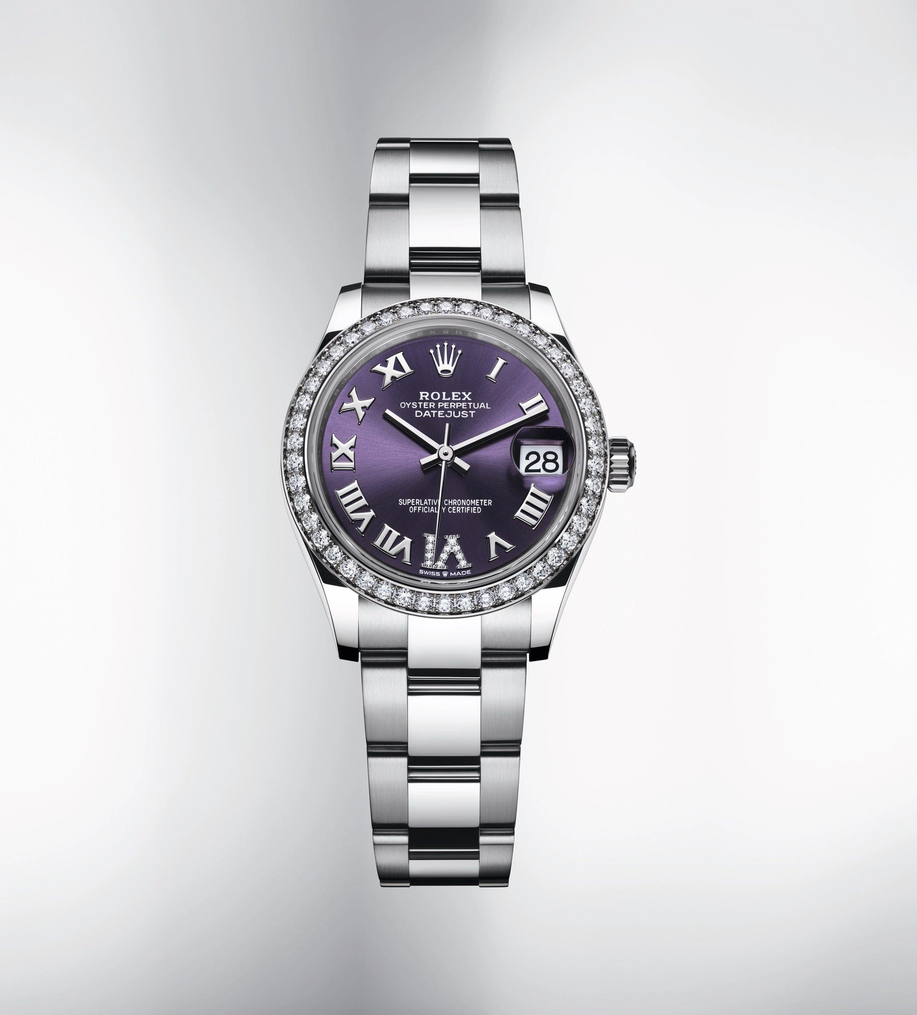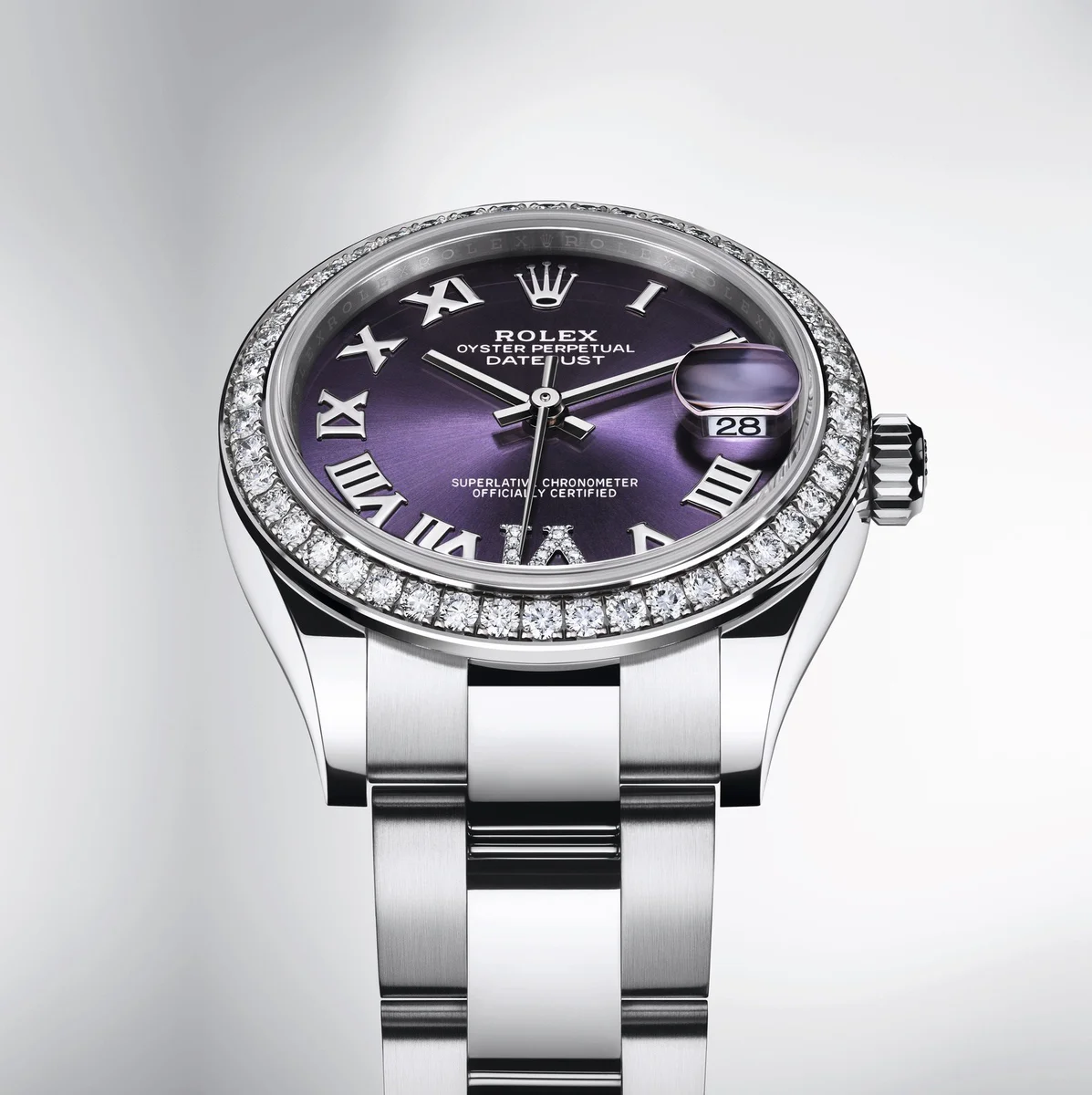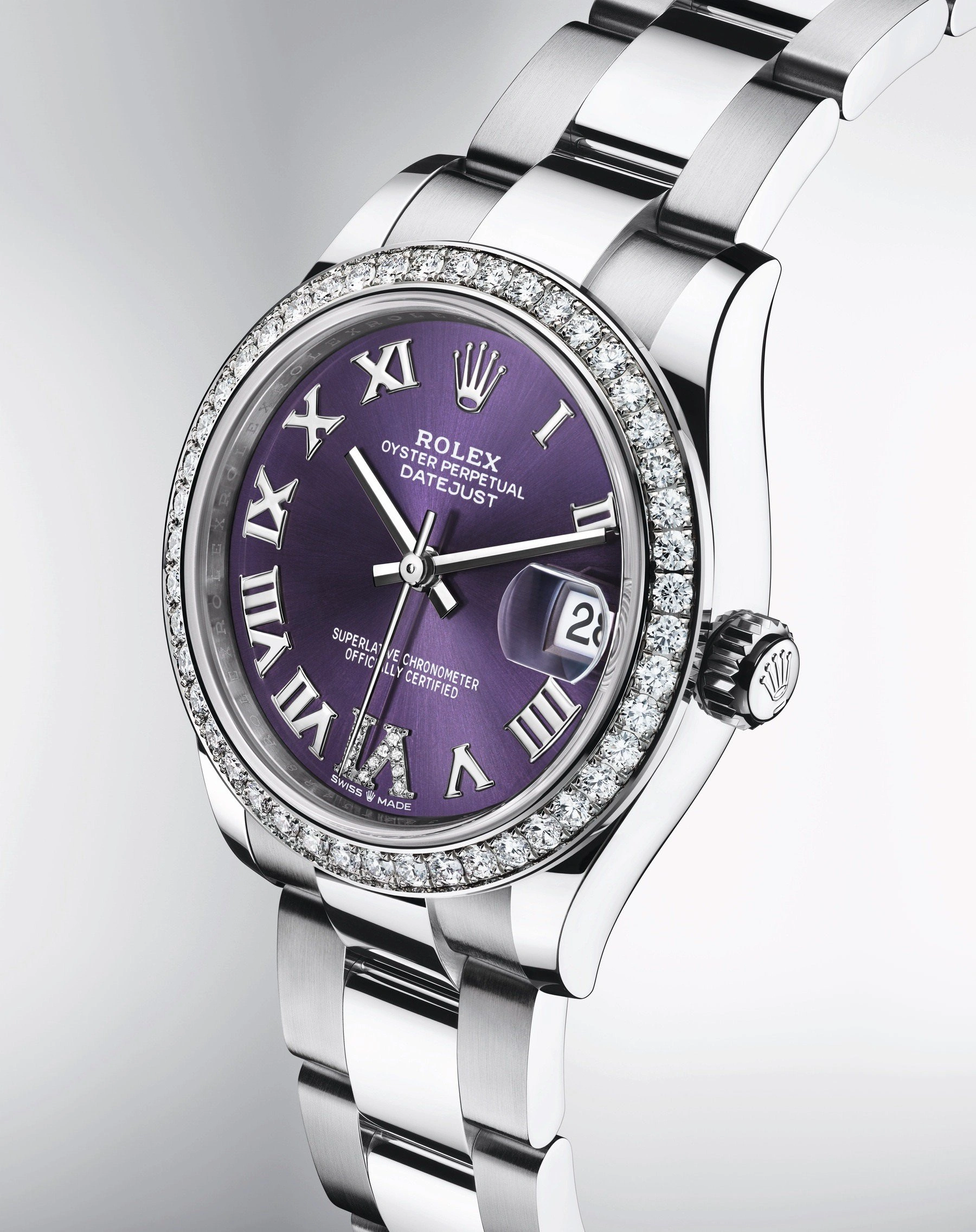 The Rolex Oyster Perpetual 31 reference 278384rbr-0029 was introduced in 2020. This watch has a stainless steel case (31.00mm) with white gold, diamond-set bezel, which holds the self-winding caliber 2236. The dial is Purple.
