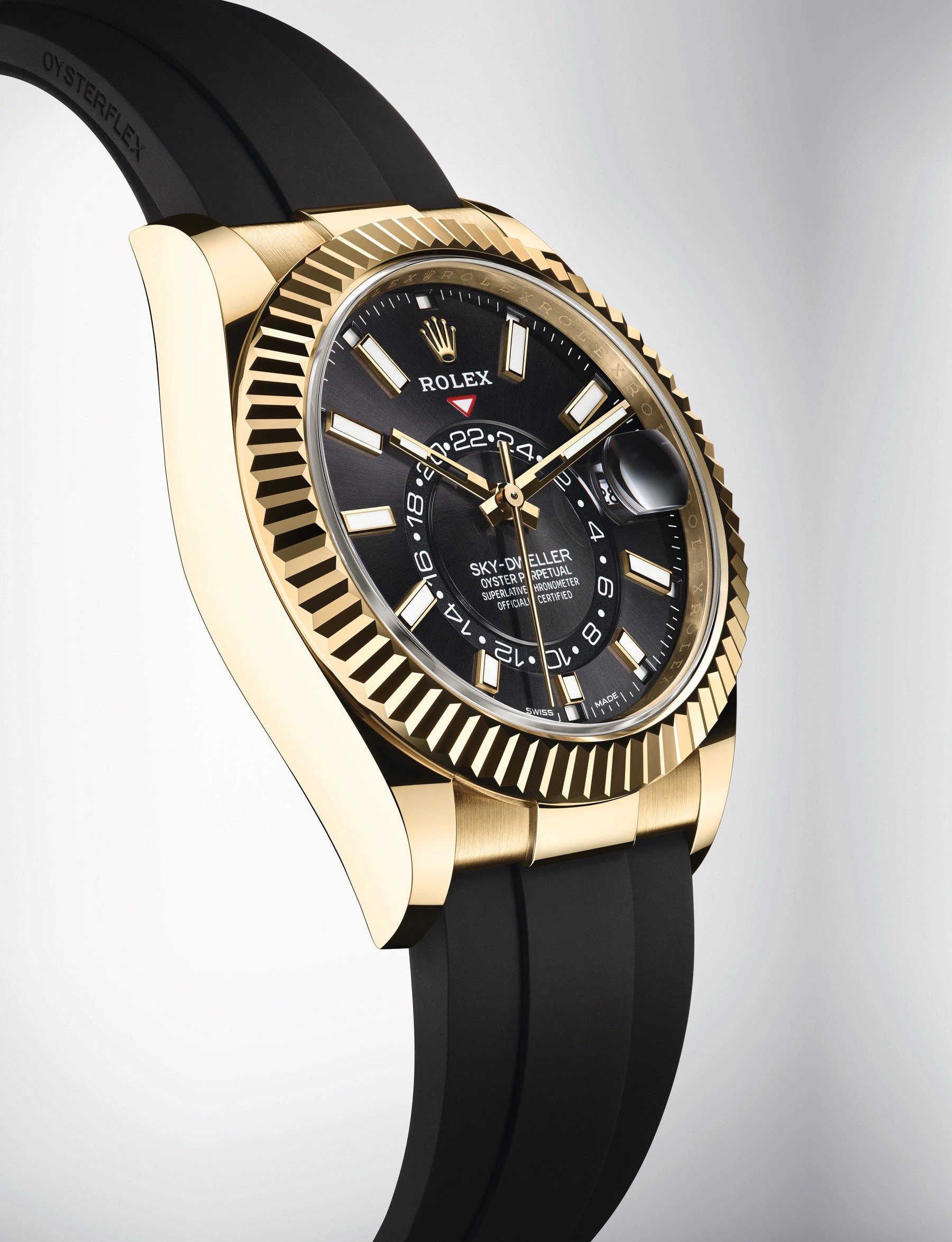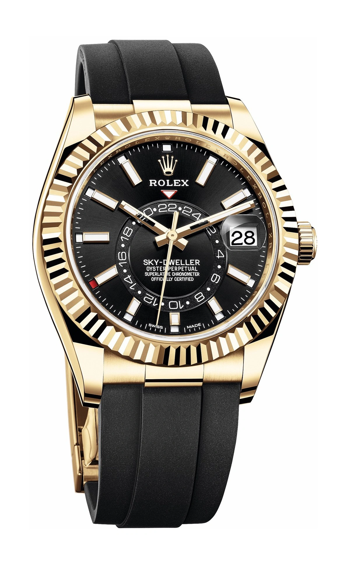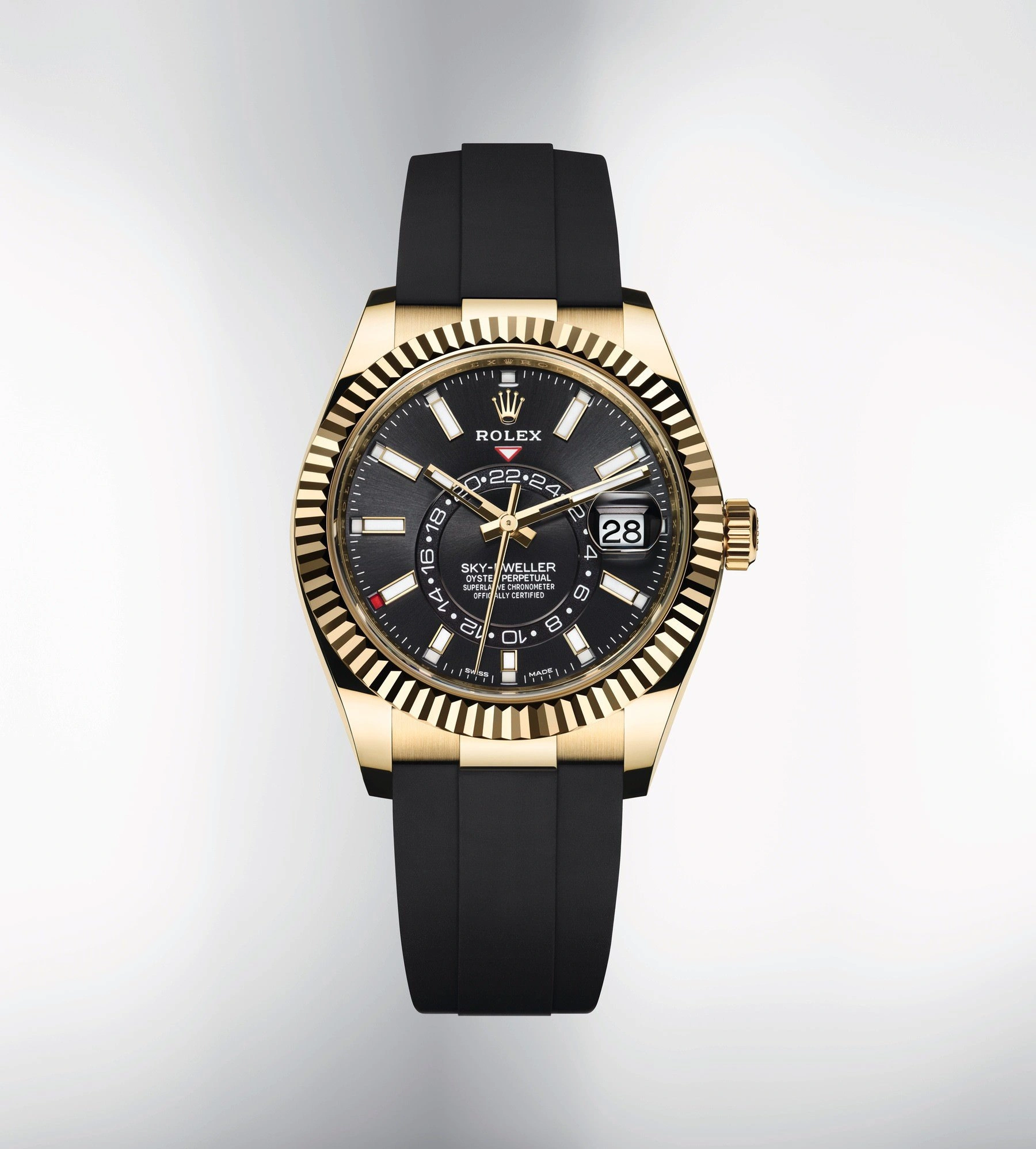 The Rolex Oyster Perpetual Sky-Dweller was introduced in 2012 and is one of Rolex' most complicated watches to date. It features an annual calendar and a second time zone function. The former has a regular date display, while the month is displayed through apertures by the hour markers. The latter is indicated through an off-centre 24h disc at 6 o'clock. The well-known fluted bezel functions as sort of a gear box with three positions, enabling the user to set the date, local time and second time zone through one single position on the crown. Reference 326238-0009 was added to the collection in 2020. It features a Black dial and is fitted with an 'Oysterflex' rubber bracelet.