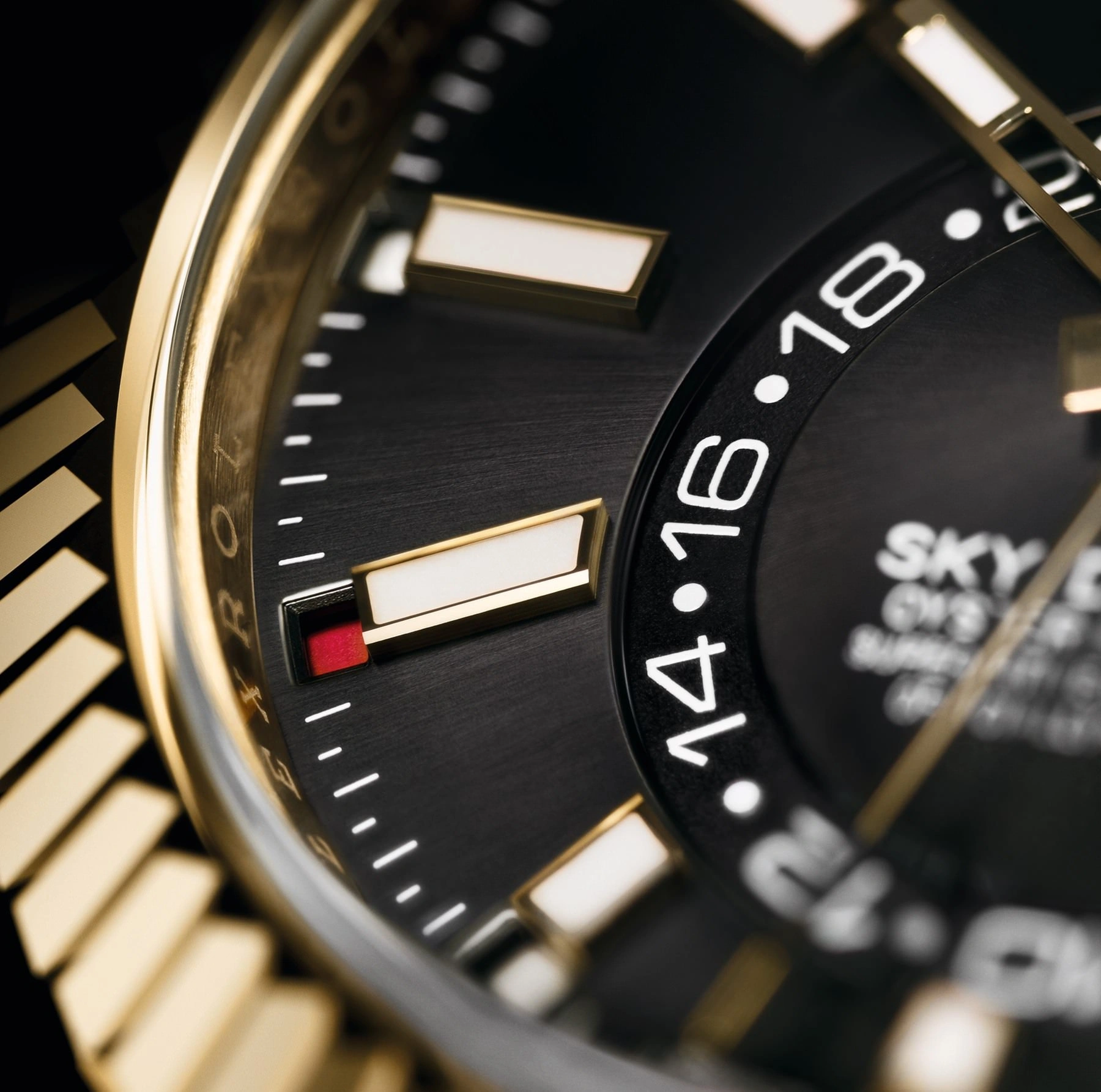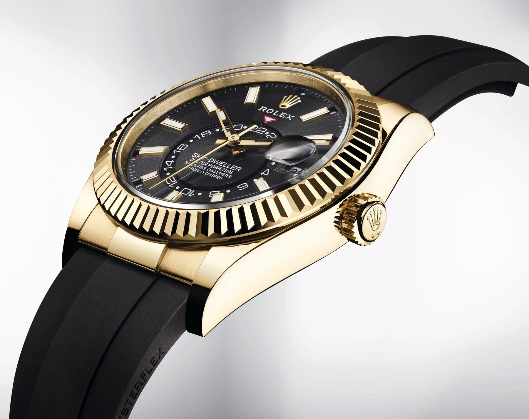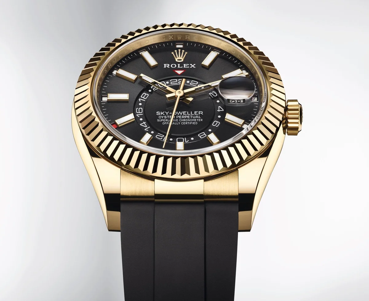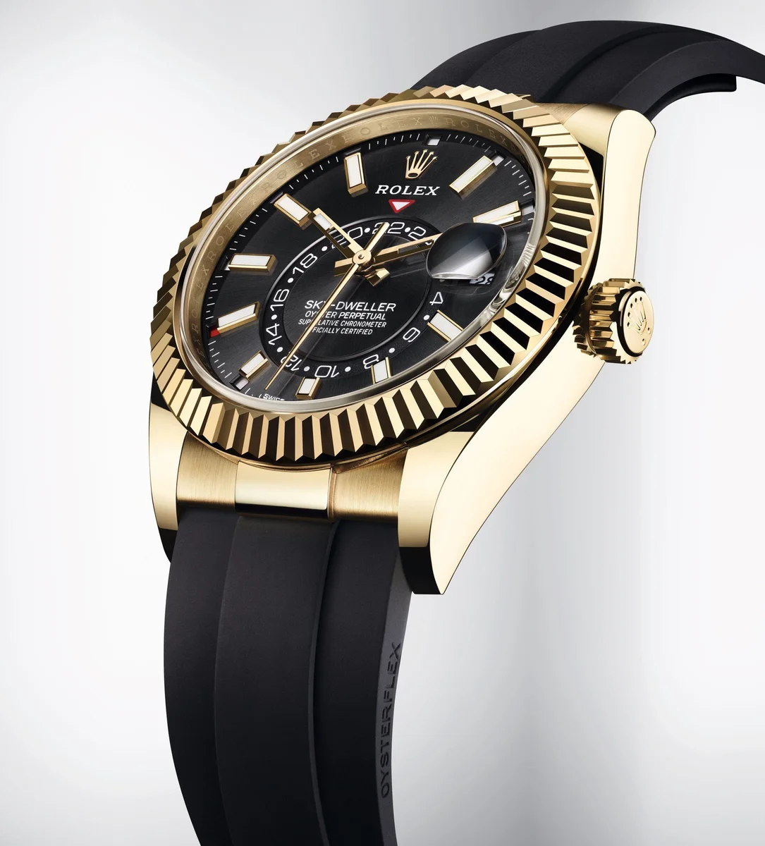 The Rolex Oyster Perpetual Sky-Dweller was introduced in 2012 and is one of Rolex' most complicated watches to date. It features an annual calendar and a second time zone function. The former has a regular date display, while the month is displayed through apertures by the hour markers. The latter is indicated through an off-centre 24h disc at 6 o'clock. The well-known fluted bezel functions as sort of a gear box with three positions, enabling the user to set the date, local time and second time zone through one single position on the crown. Reference 326238-0009 was added to the collection in 2020. It features a Black dial and is fitted with an 'Oysterflex' rubber bracelet.