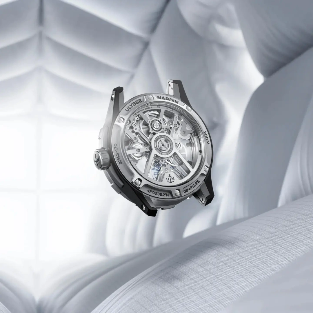 Ulysse Narding DIVER AIR Ref. 3743-170-2A/0A with a 44mm case in a Titanium / Nylon / Carbon Fibre mix. Total weight of just 51.51g. Building upon the foundation of the Diver X Skeleton UN-372 movement, Ulysse Nardin developed a new, innovative, hightech calibre, the UN-374, which had to be entirely rethought and redesigned. To achieve the Diver [AIR]’s exceptionally light weight of just 52g, including the strap, and under 46g without it, material had to be removed from the Diver X Skeleton’s calibre, while ensuring the watch’s reliability and performance remained uncompromised.