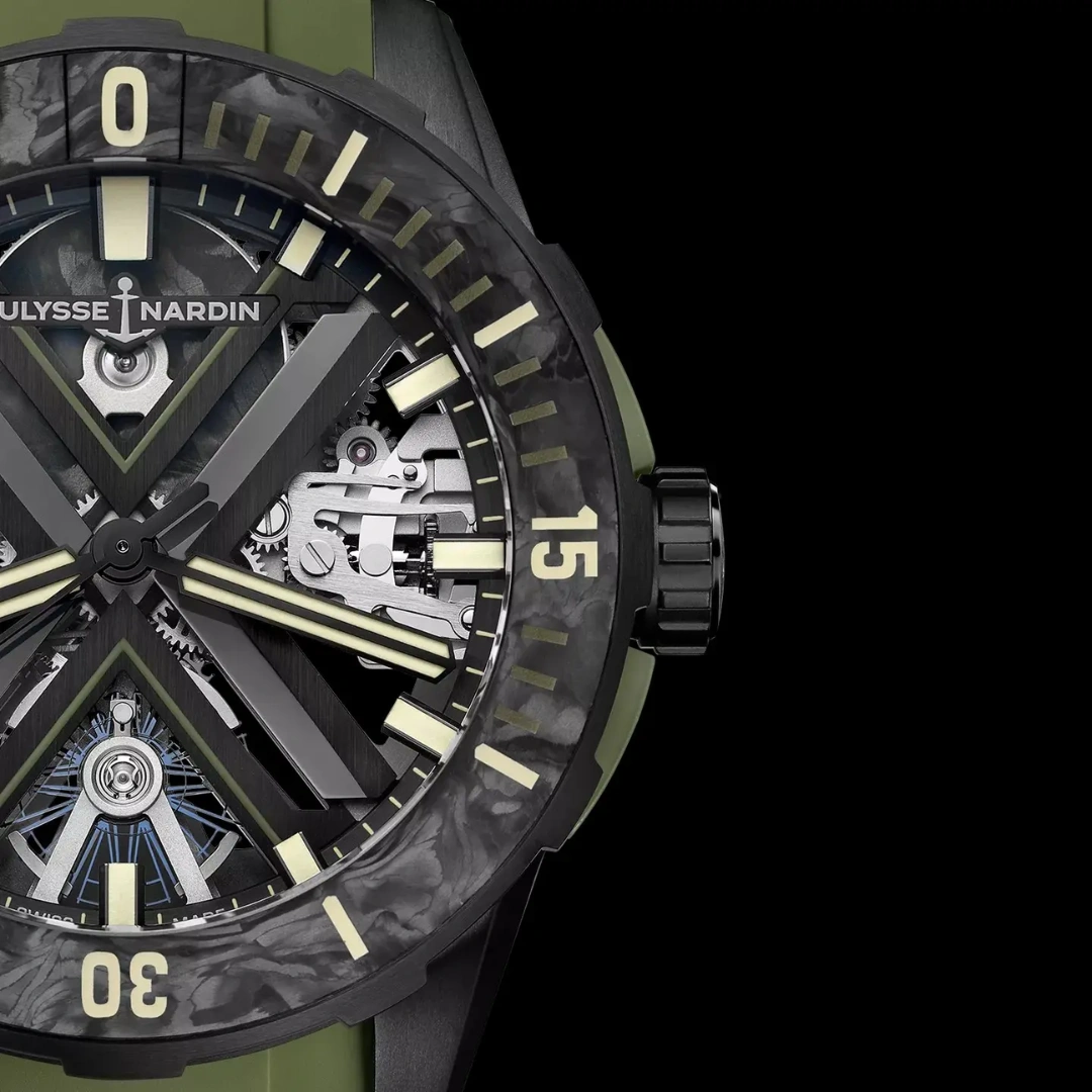 The Diver [X SKELETON OPS] ref. 3723-170-2C/3A is an avant-garde dive watch reimagined as Haute Horlogerie. It features a 44 mm case, water resistance up to 200 meters, and the skeletonized automatic movement UN-372 with a silicon escapement and oversized oscillator. The watch showcases Carbonium® in both the bezel and barrel cover. Its ultra-modern design includes a prominent skeleton X structure on the dial and a lightweight titanium case with a black DLC coating. Completing its bold style and sustainable approach is a khaki green fabric strap made partly from upcycled fishing nets or a green rubber strap. A sporty appeal, while taking a radical step towards transparency Diver X Skeleton is an explosive fusion between the sporty design of a Diver and technical prowess of the Blast Skeleton.