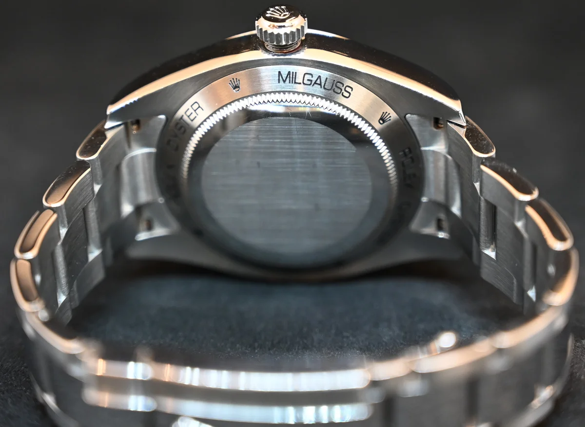 The reliability and precision of an ordinary mechanical watch can be affected by a magnetic field of 50 to 100 gauss. But many scientists are exposed to much higher magnetic fields during the course of their work. Rolex’s solution was the Milgauss, created in 1956, the first watch of its kind. Hence the name of the watch, mille being French for thousand. The reference 116400 was introduced in 2007. The black dial model (non-GV) was discontinued in 2013. The Z-Blue version was added in 2014.