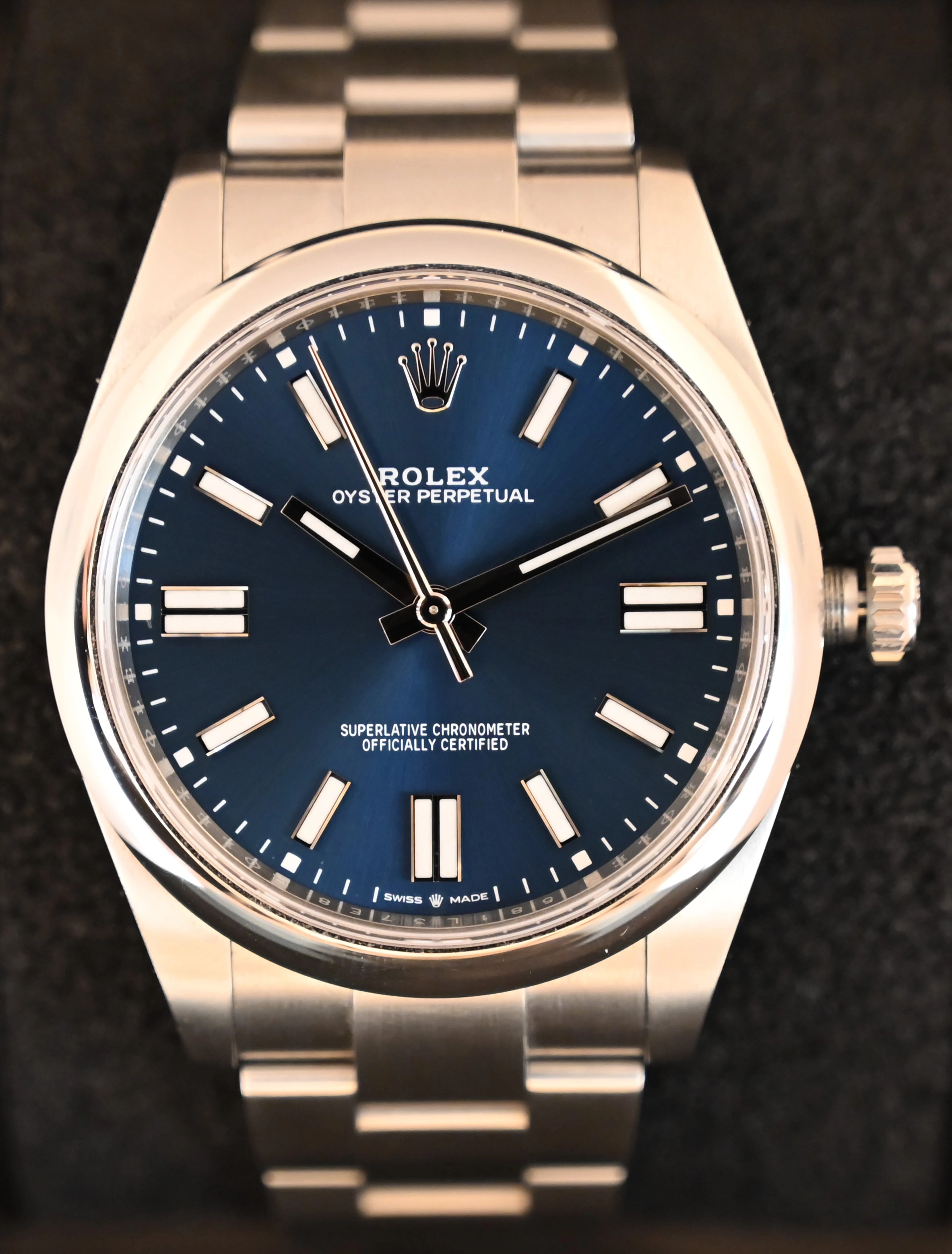 The Rolex Oyster Perpetual 41 reference 124300-0003 was introduced in 2020. This watch has a Stainless Steel case of 41.00mm, which holds the self-winding caliber 3230. The dial is Blue.