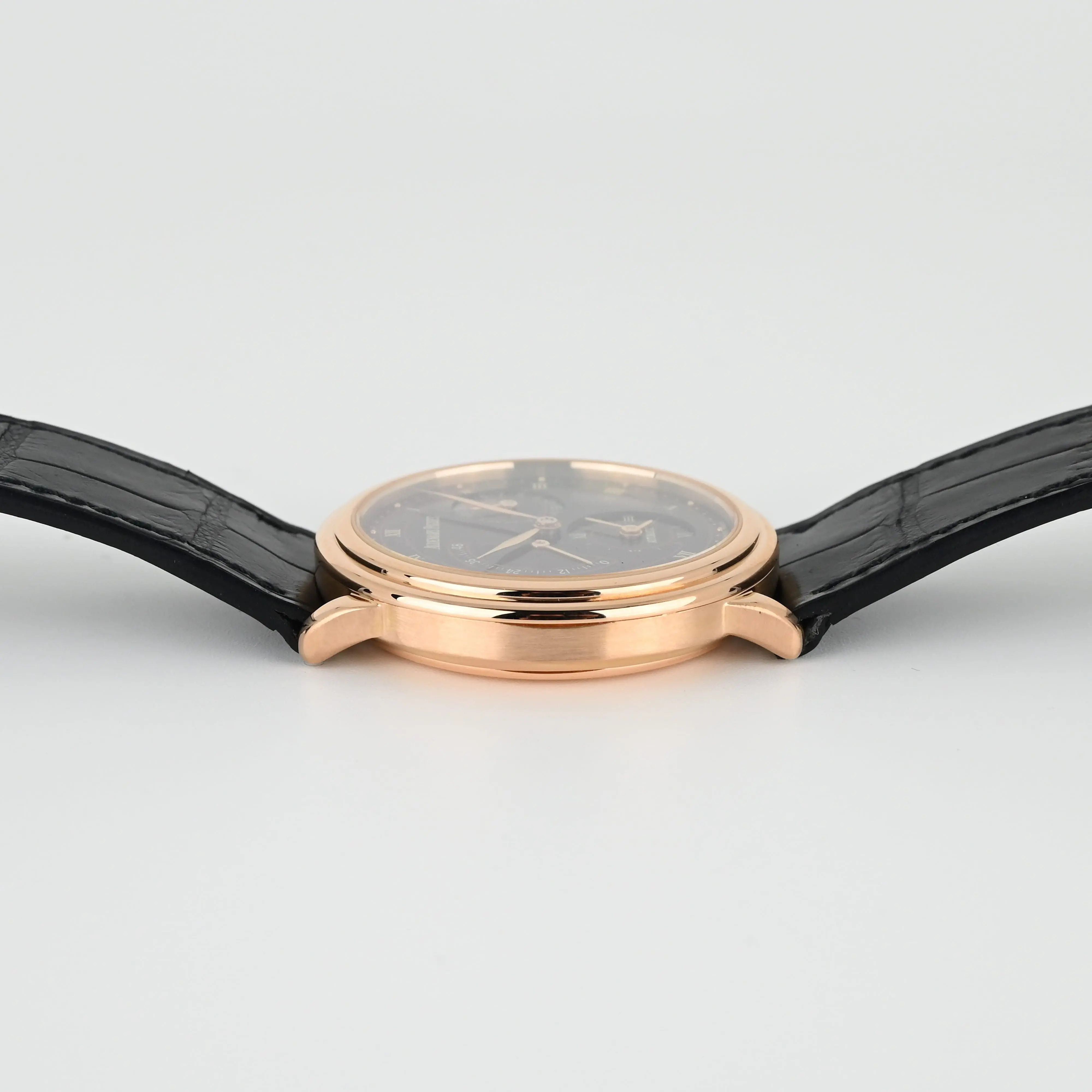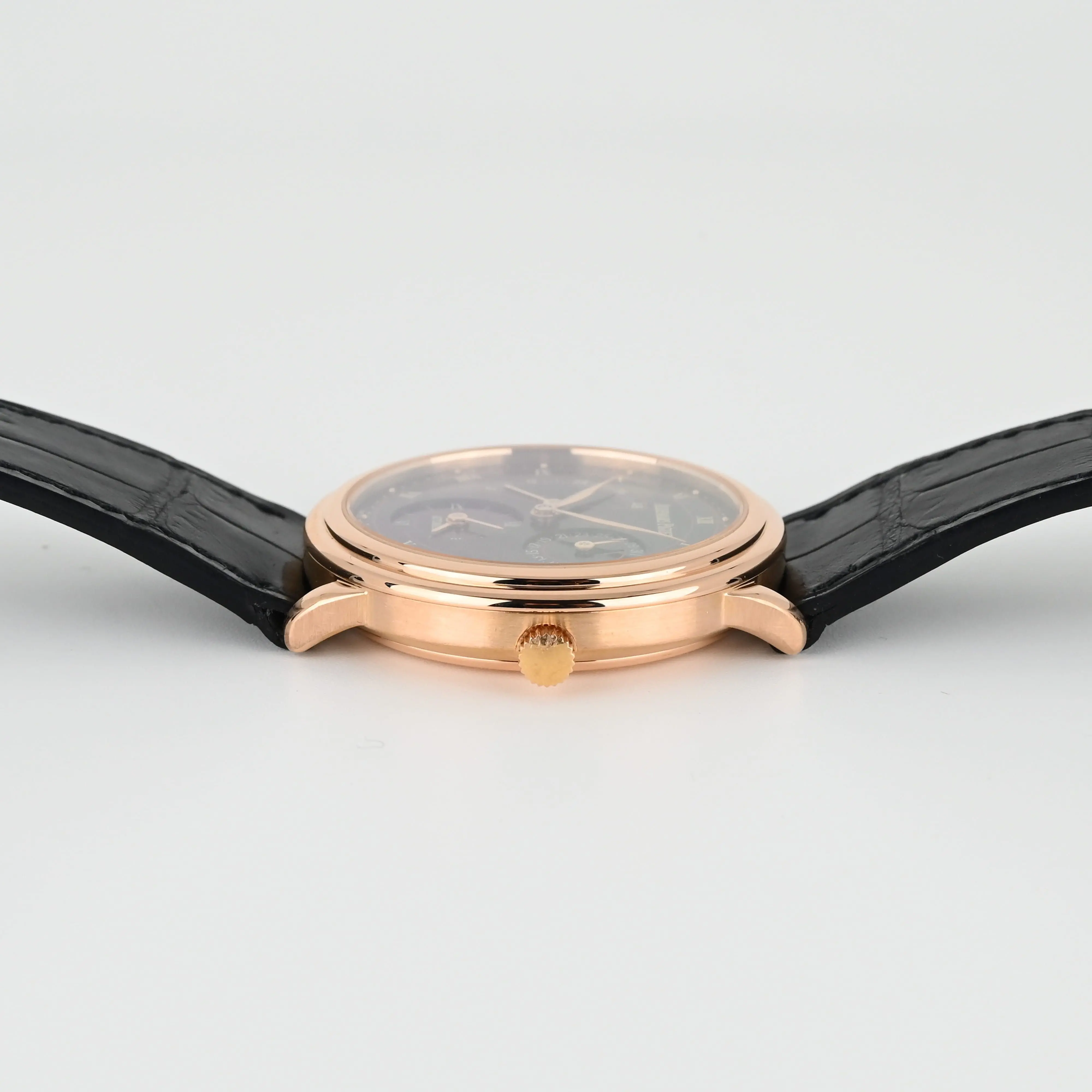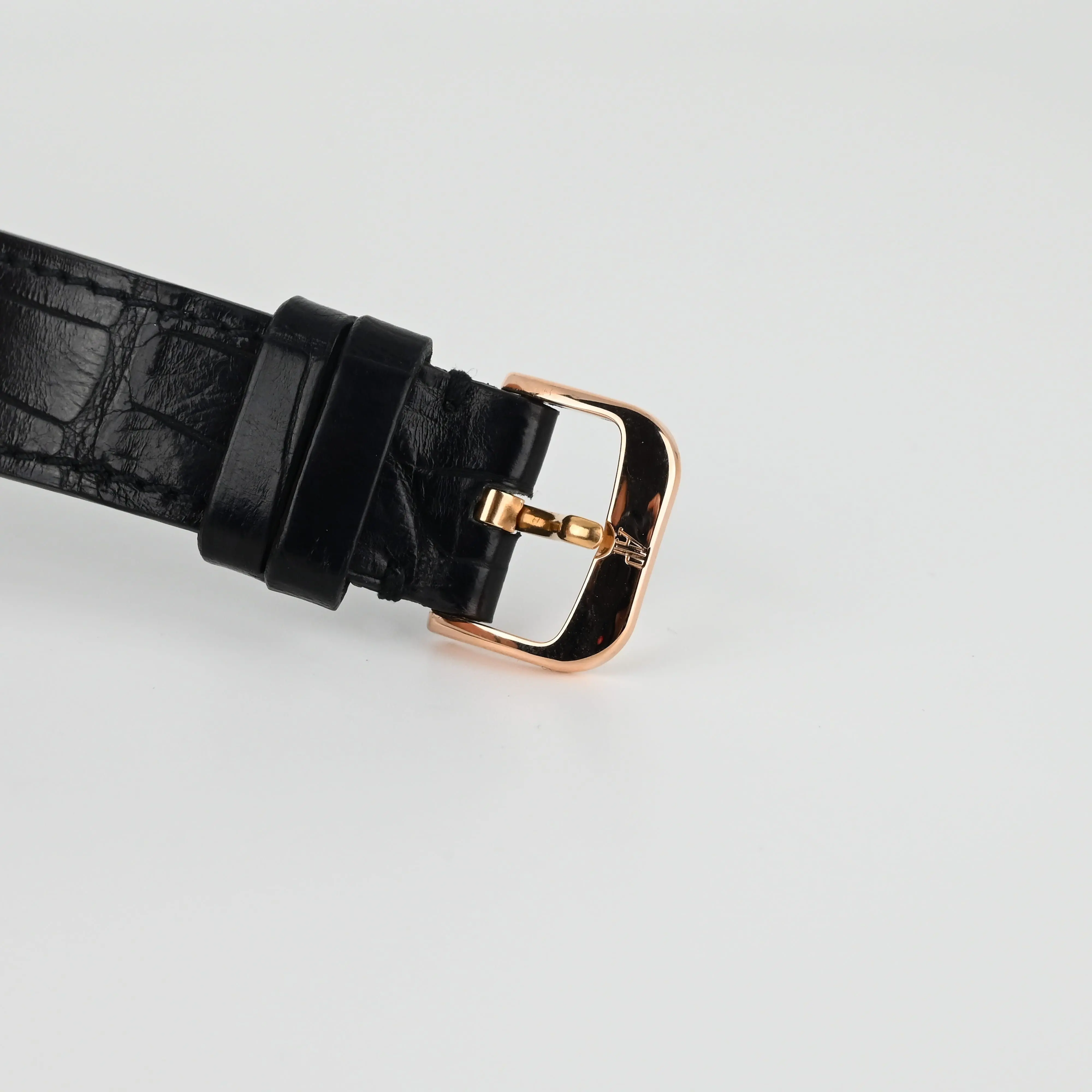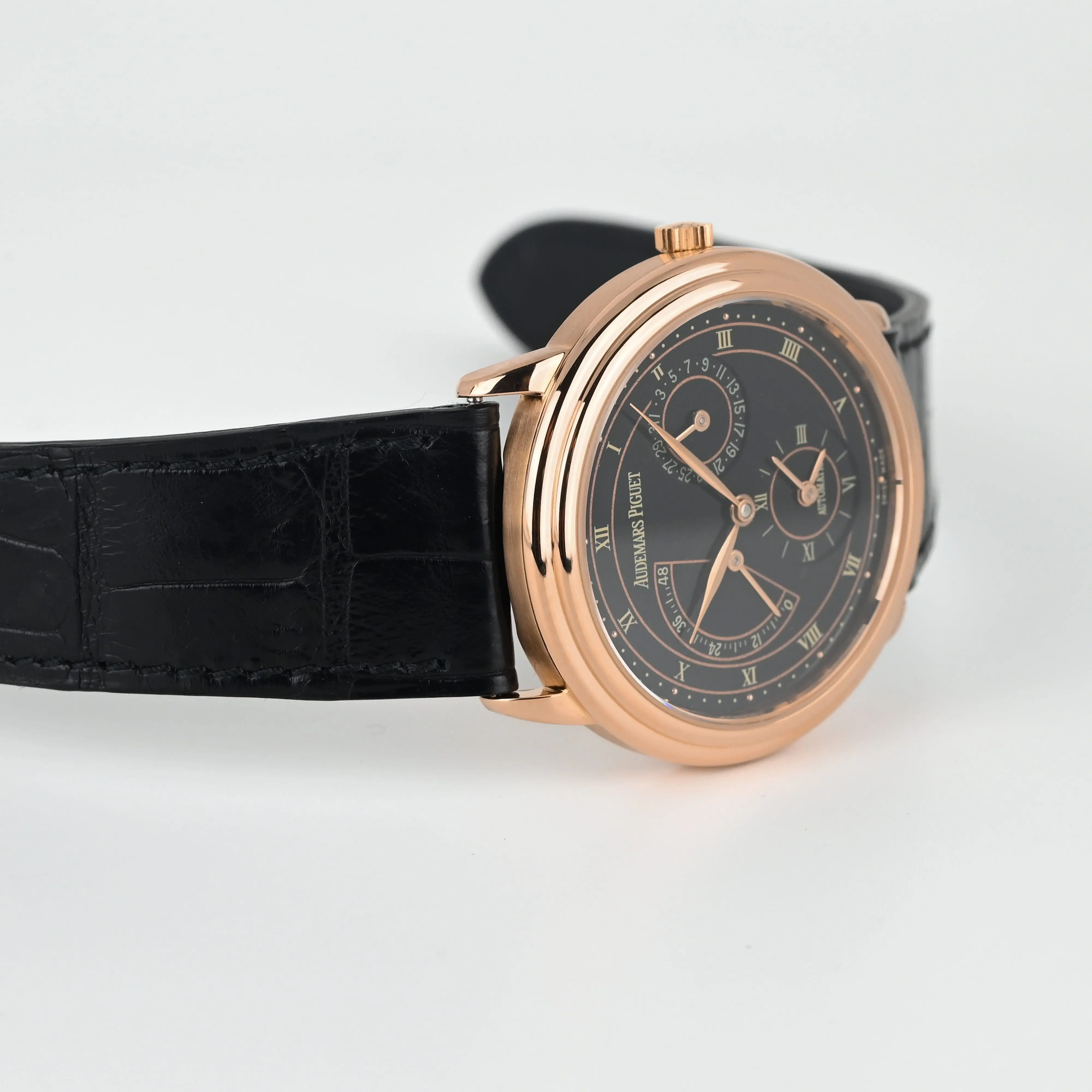 Audemars Piguet Jules Audemars Ref. 25685OR a tribute to one of the founders of Audemars Piguet, embodies horological excellence and the timeless elegance of complicated dress watches. Introduced in the 1990s, this rare timepiece stands out for its 36mm 18-karat rose gold case, featuring short, discreet lugs, and its ultra-thin profile of just 8.5mm, making it ideal for refined everyday wear. Its exceptionally rare onyx dial creates a striking contrast with the Roman numerals and rose gold hands, offering clear and elegant readability.