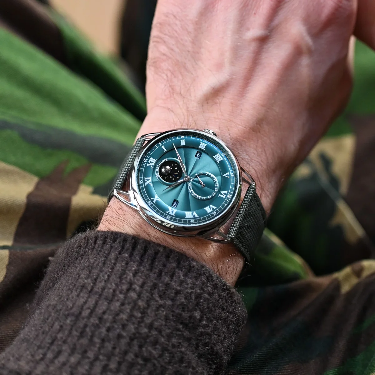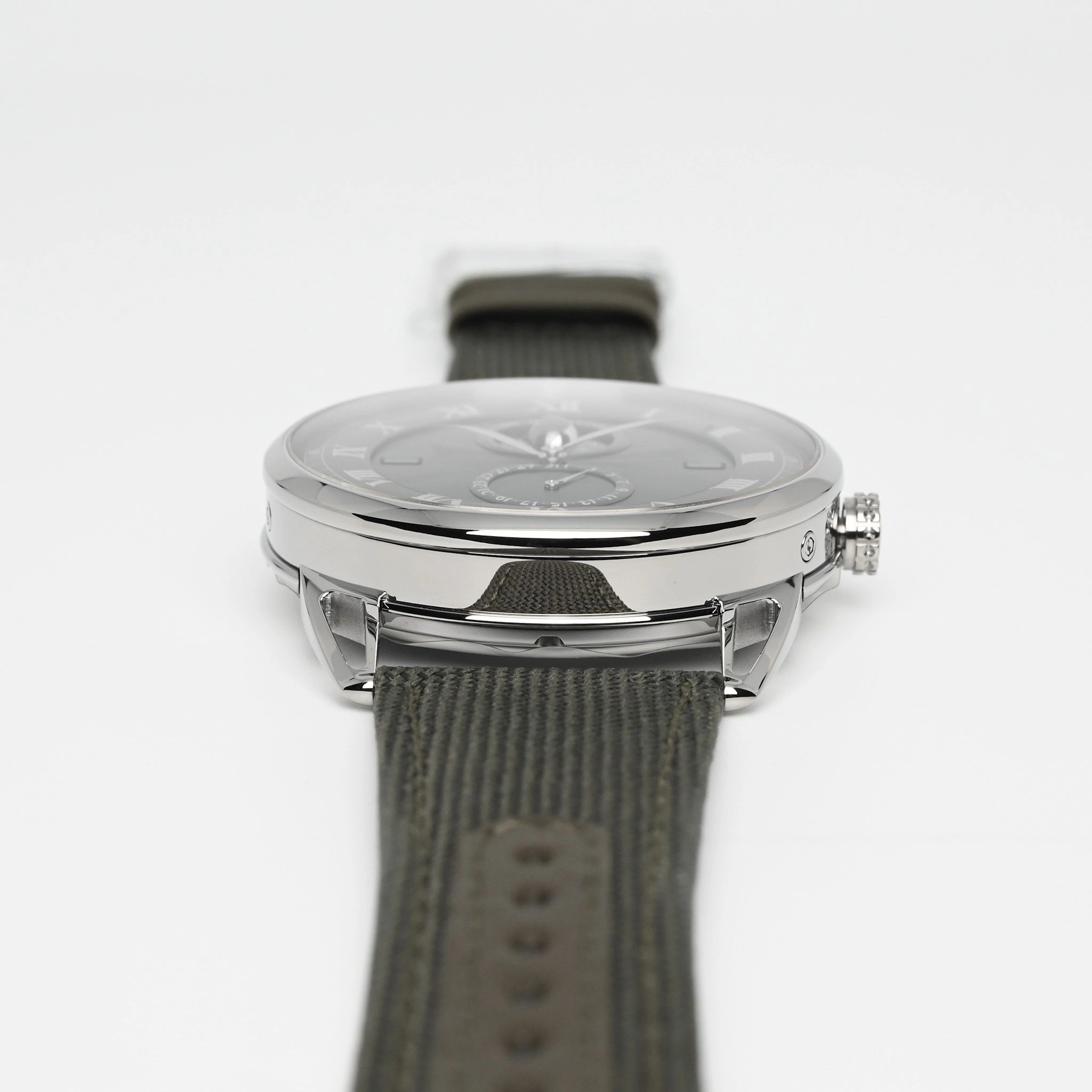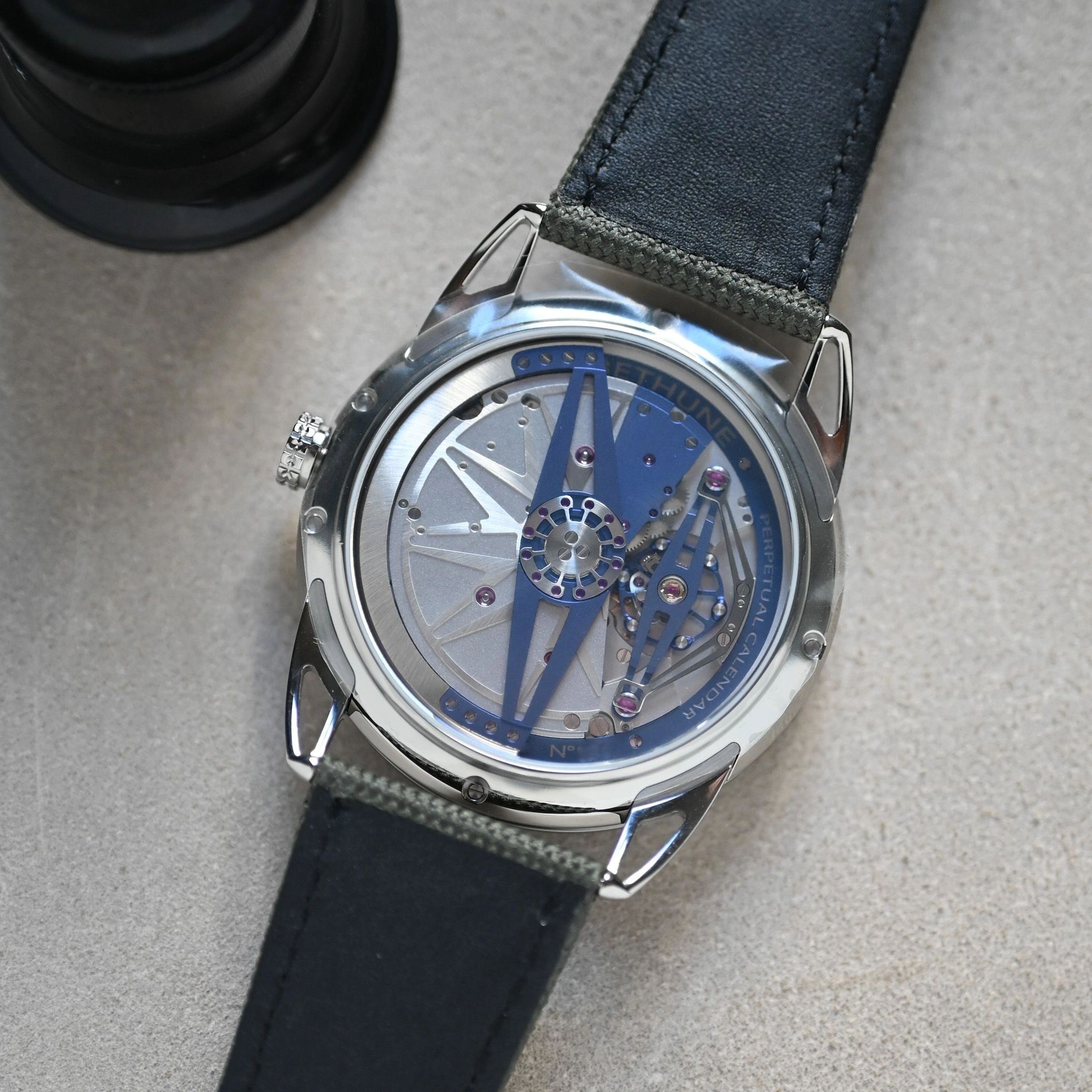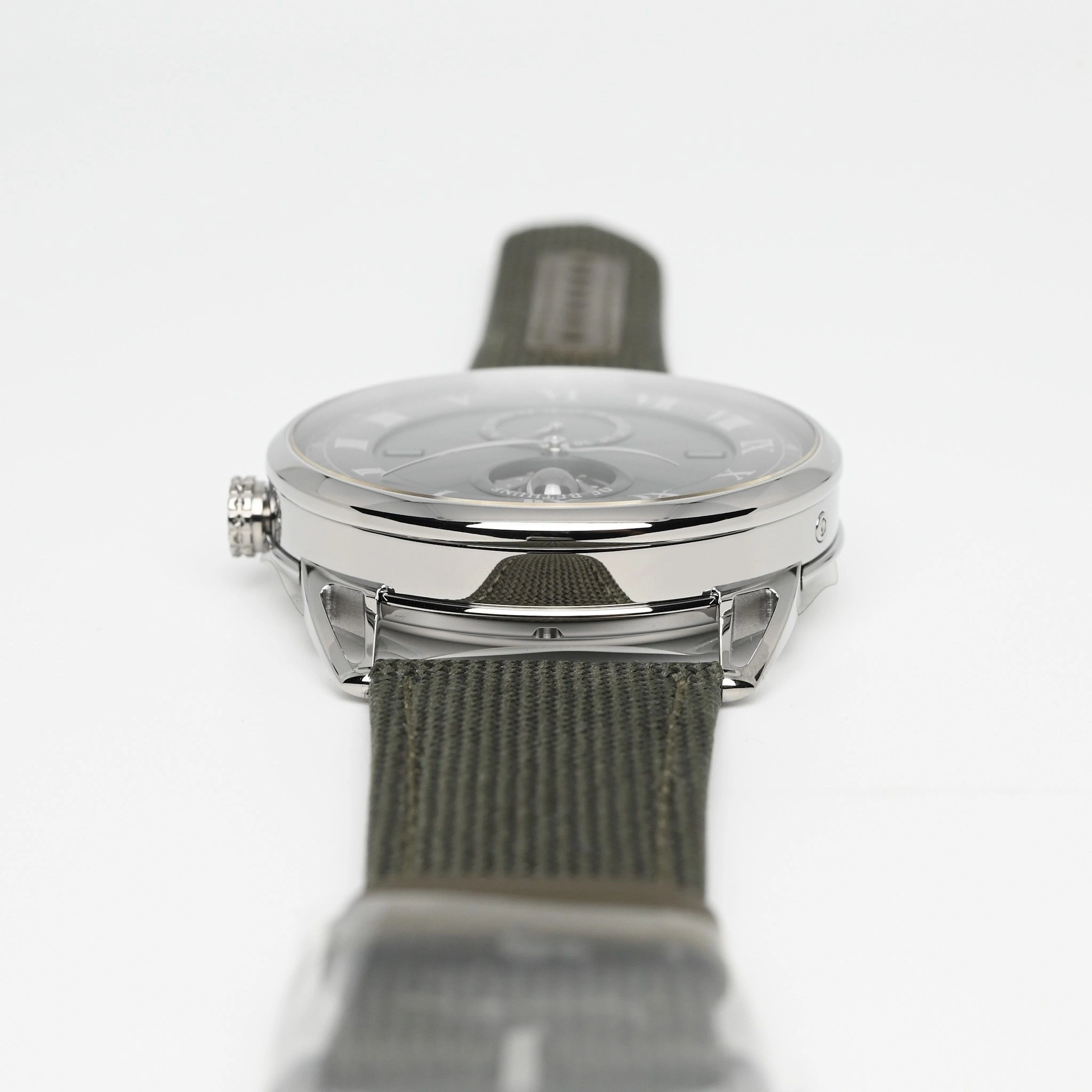 Spherical moon phase indication in palladium and black oxide zirconium with an accuracy of one lunar day every 122 years at 12 o’clock – De Bethune Patent (2004)
