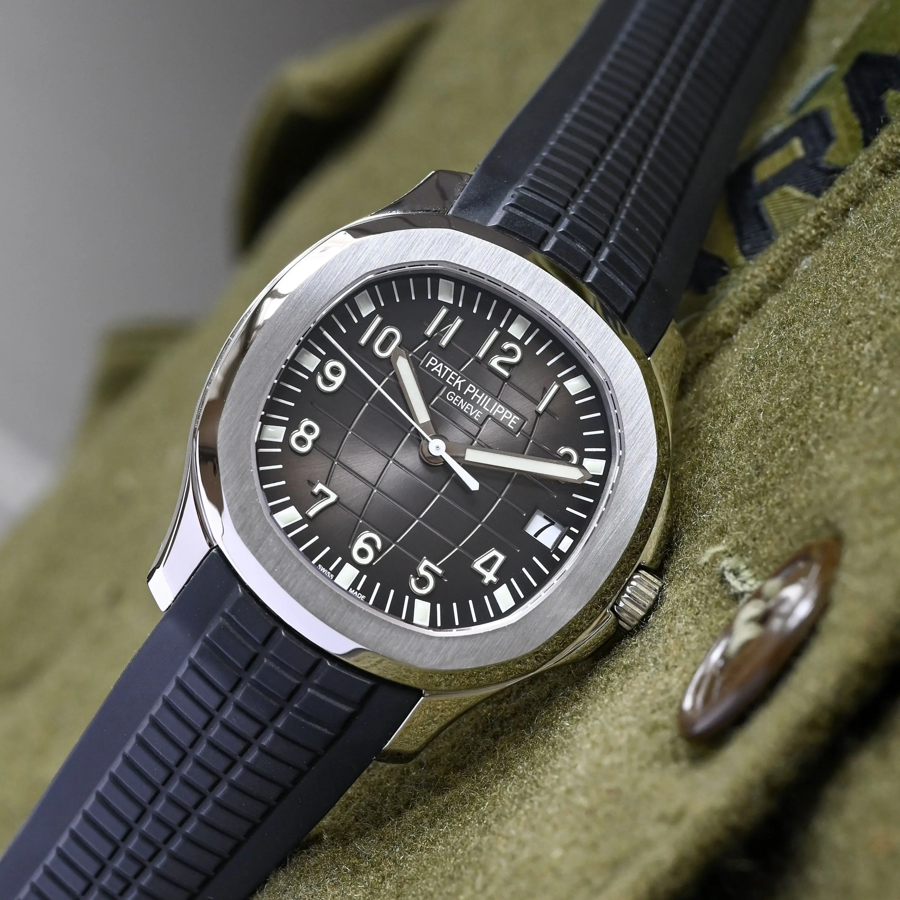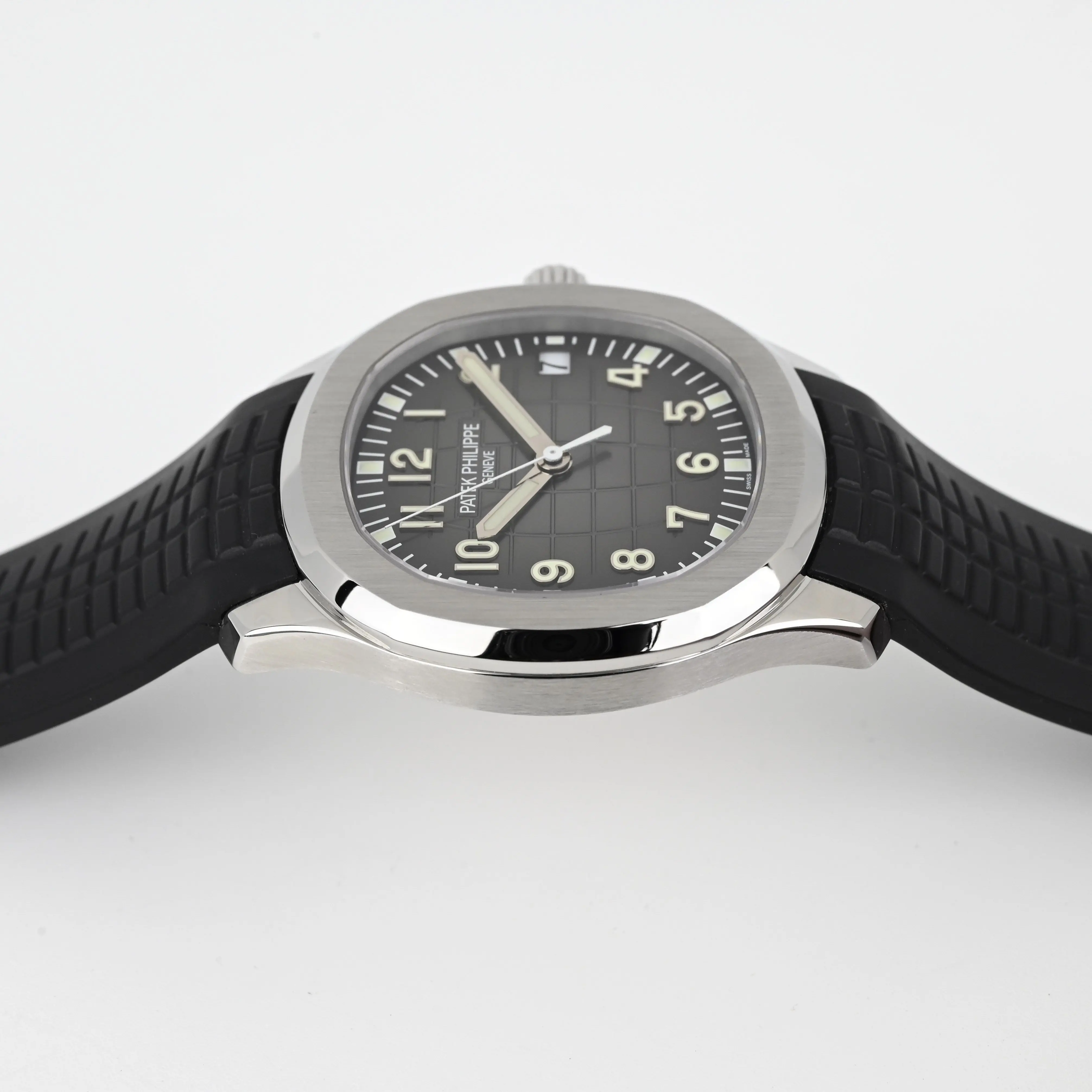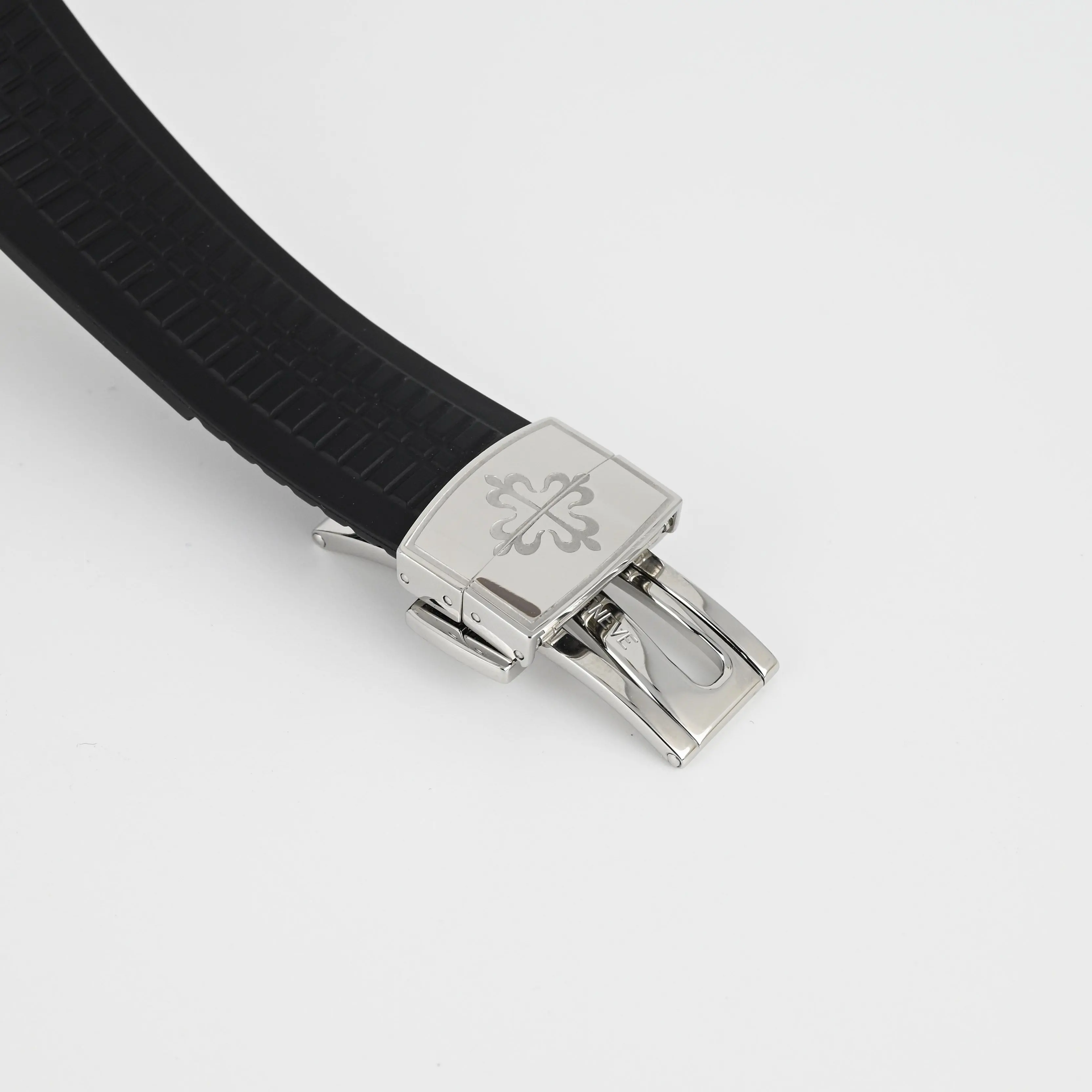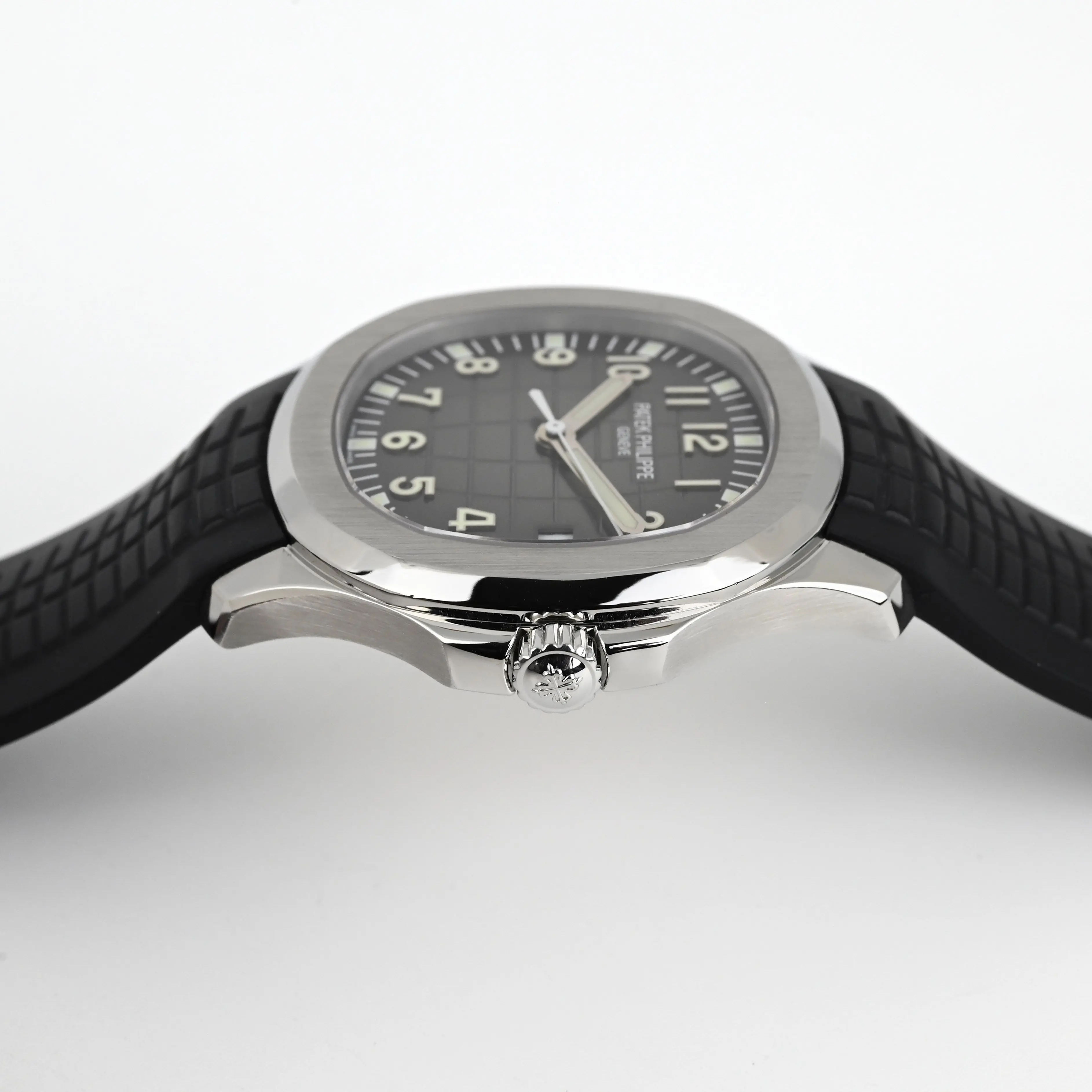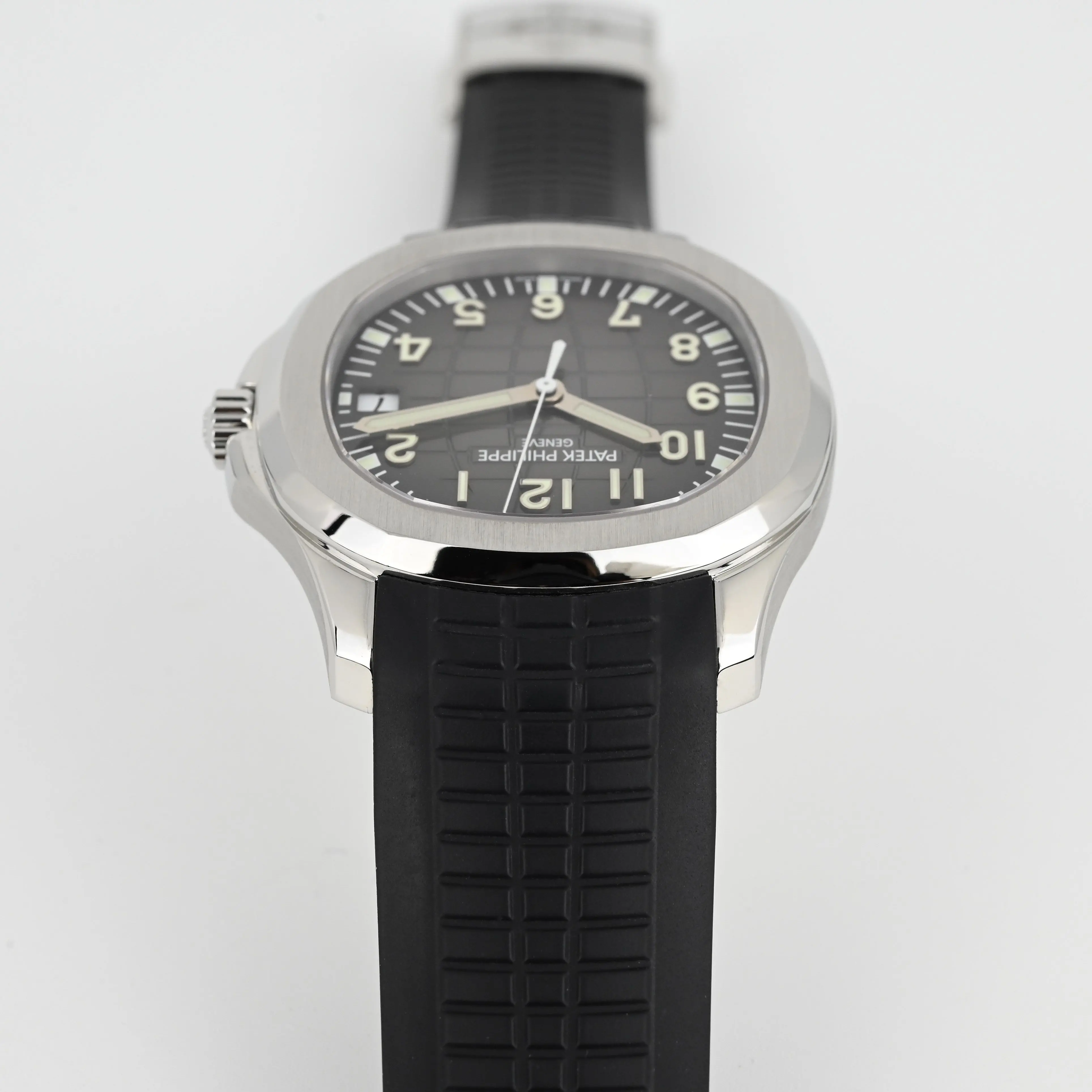 The Patek Philippe Nautilus 5167A-001 featuers a stainless steel case and a 'tropic' style rubber strap. It is powered by the self-winding caliber 324 S C. Reference 5167/1A-001 is similar yet fitted with a stainless steel bracelet. It is also available in rose gold. Mechanical self-winding movement Caliber 324 S C Aquanaut extra large Sweep seconds hand Embossed black dial, gold applied numerals with luminescent coating “Tropical“ composite black strap Fold-over clasp Screw down crown Sapphire-crystal case back Water resistant to 120 m Stainless steel Case diameter (10-4 o’clock): 40 mm