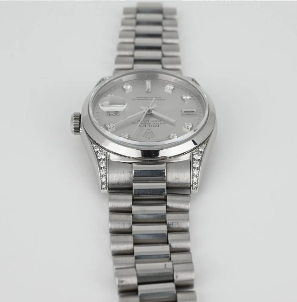 Reference 18296, produced from 1989 onwards, is one of the most prestigious variations of the Day-Date, made exclusively in platinum. With a diameter of 36 mm, it is distinguished by its diamond-set lugs - a detail that further accentuates its luxurious and exclusive character, and contrasts with the simplicity of the smooth bezel. This reference is equipped with the calibre 3155. This automatic movement incorporates the rapid day and date change function via the crown, a major evolution in terms of ease of use. It offers a power reserve of around 48 hours and is chronometer-certified.