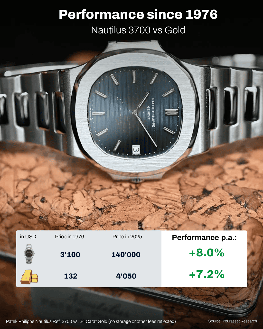 The secondary market for luxury watches has appreciated significantly over the years, with the Patek Philippe Nautilus in steel being a notable example. The price of a Patek Philippe Nautilus ref. 3700 has appreciated over 4500% from 1976 until today, while Gold appreciated by nearly 3100%.